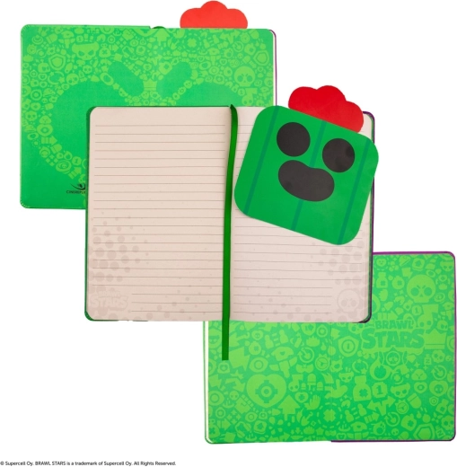 Oplev et originalt hårdt omslag til notesblok inspireret af figuren Spike fra spillet BRAWL STARS. Den grønne forside med hævede sorte detaljer ved øjne og mund giver et attraktivt 3D-look, mens den lilla bagside med et plastisk blomstermotiv tilfører omslaget en unik karakter. Blødt polstring øger komforten i daglig brug og beskytter både hjørner og kanter.