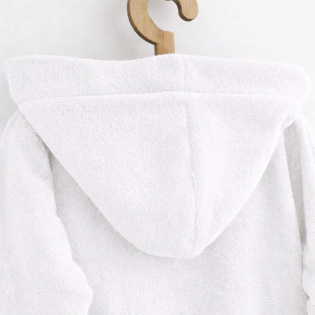 En blød børnebadekåbe NEW BABY i kvalitetsfrotté er ideel efter bad og svømning. Den har en hætte til at beskytte det våde hoved, et indsydt bælte, der ikke bliver væk, og dybe lommer til småting. Fremstillet af 100% bomuld med OEKO-TEX STANDARD 100-certificering for sart børnehud.