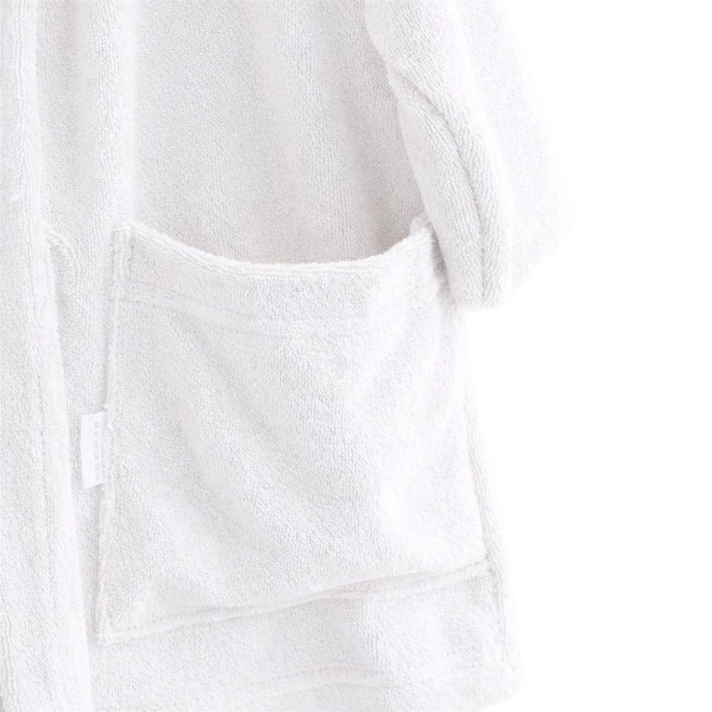Den alsidige hvide farve og den omhyggelige forarbejdning gør denne badekåbe til en pålidelig makker efter hvert bad. Størrelse 92/98 svarer cirka til alder 2–3 år (vejledende – følg målene på billedet).