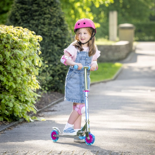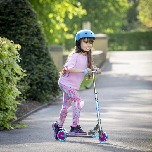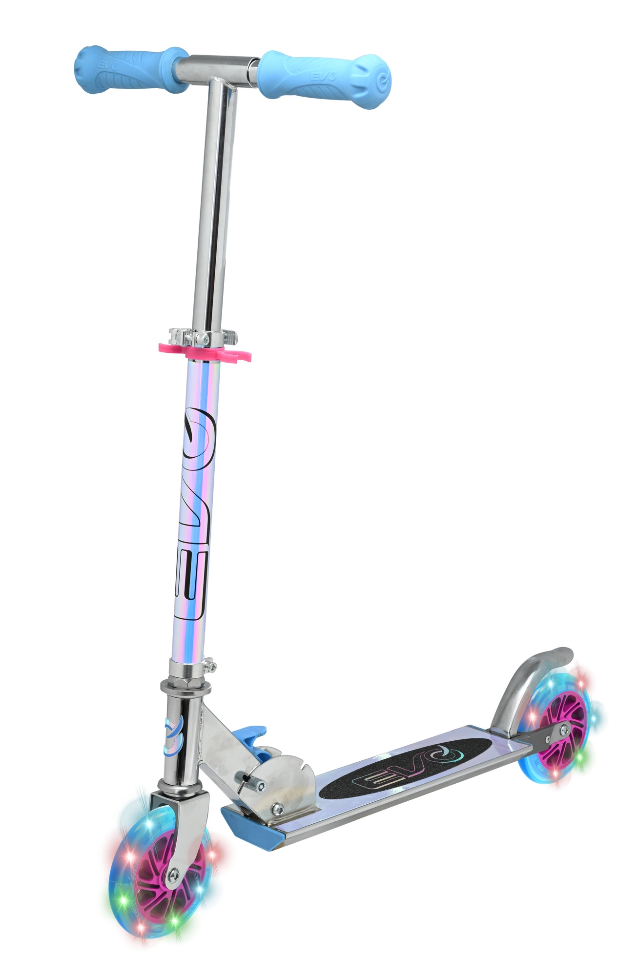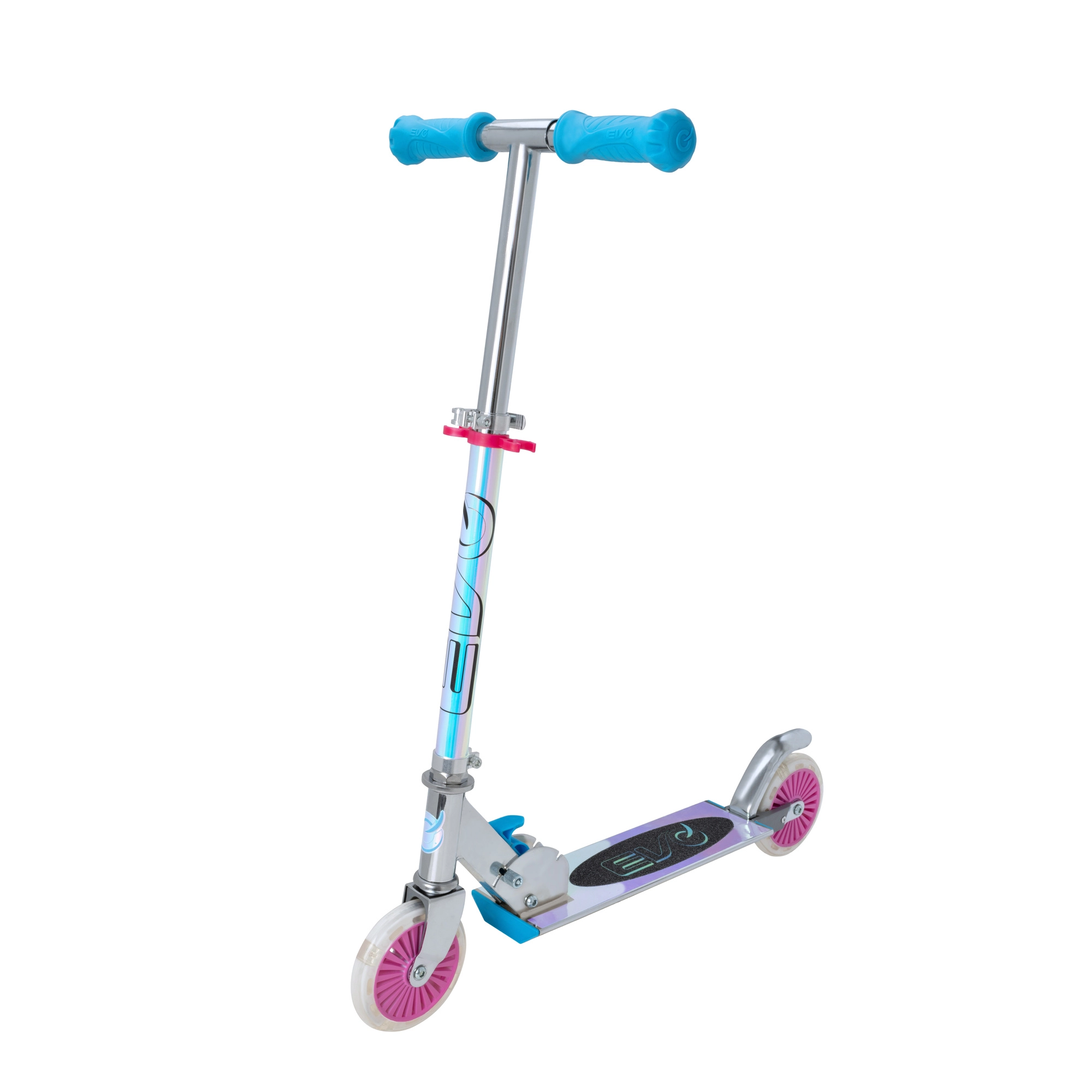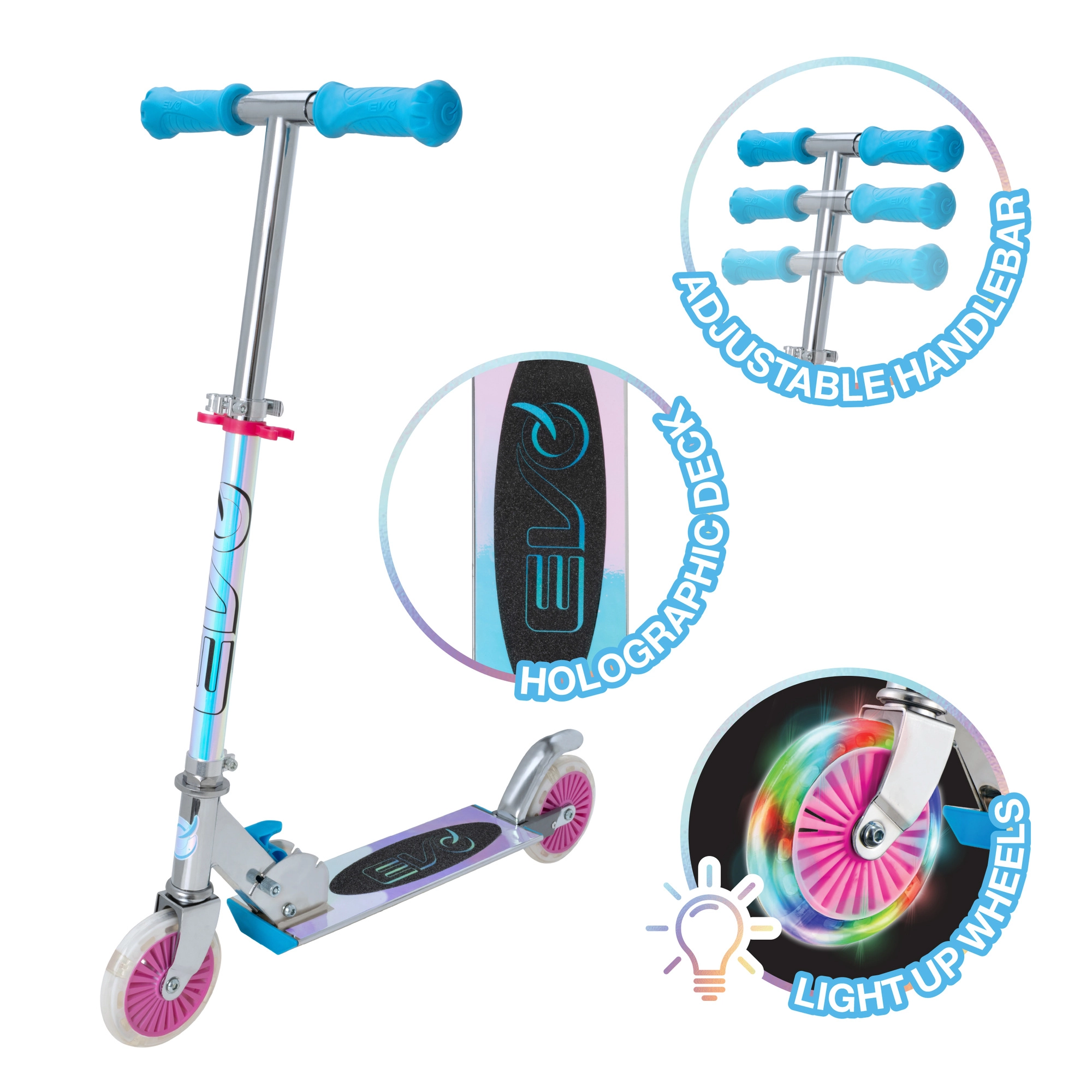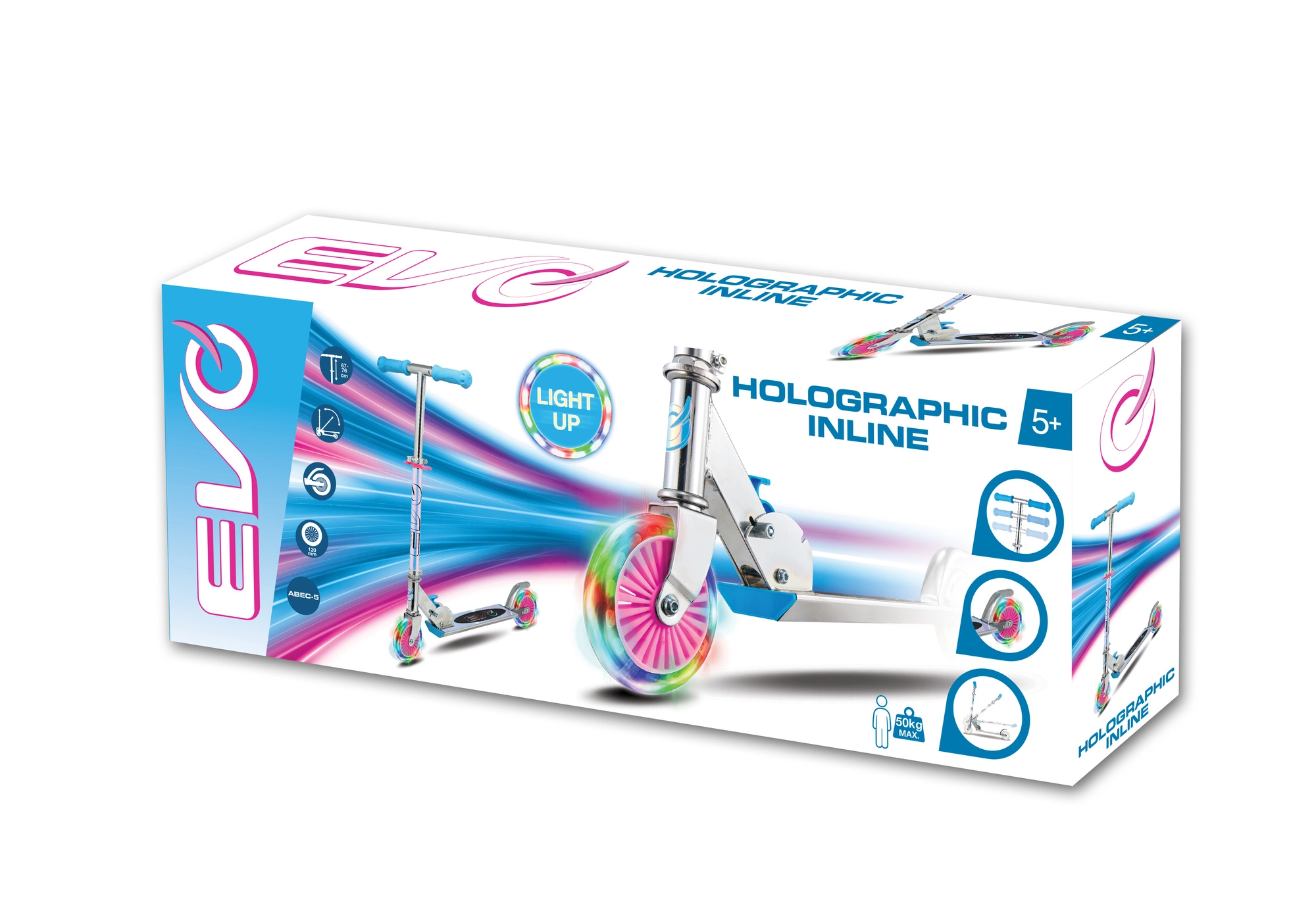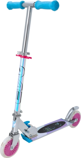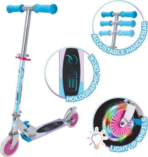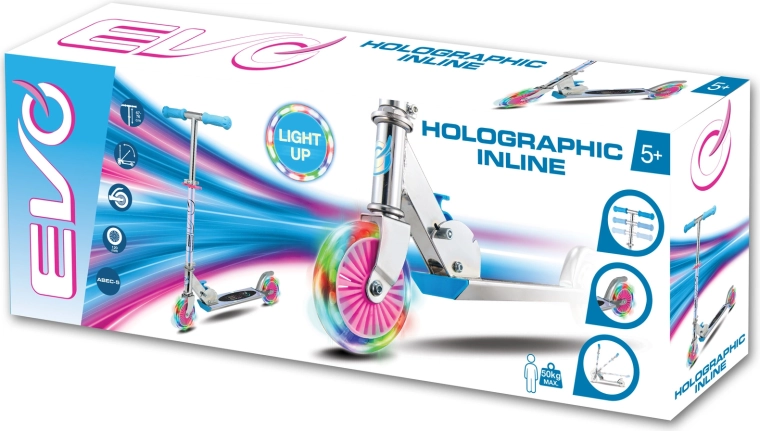 Løbehjulet EVO Holographic Inline kombinerer sjov og sikkerhed. Med lysende LED-hjul er hver tur iøjnefaldende, mens justerbar styrhøjde (ca. 67–77 cm) giver en komfortabel tilpasning til barnets vækst. Den sammenklappelige konstruktion gør det let at bære og opbevare derhjemme eller i bilens bagagerum.