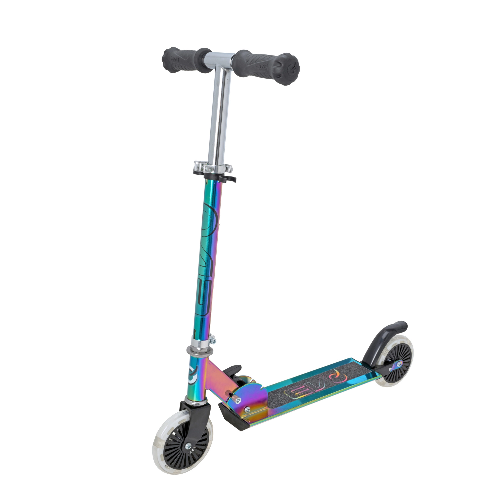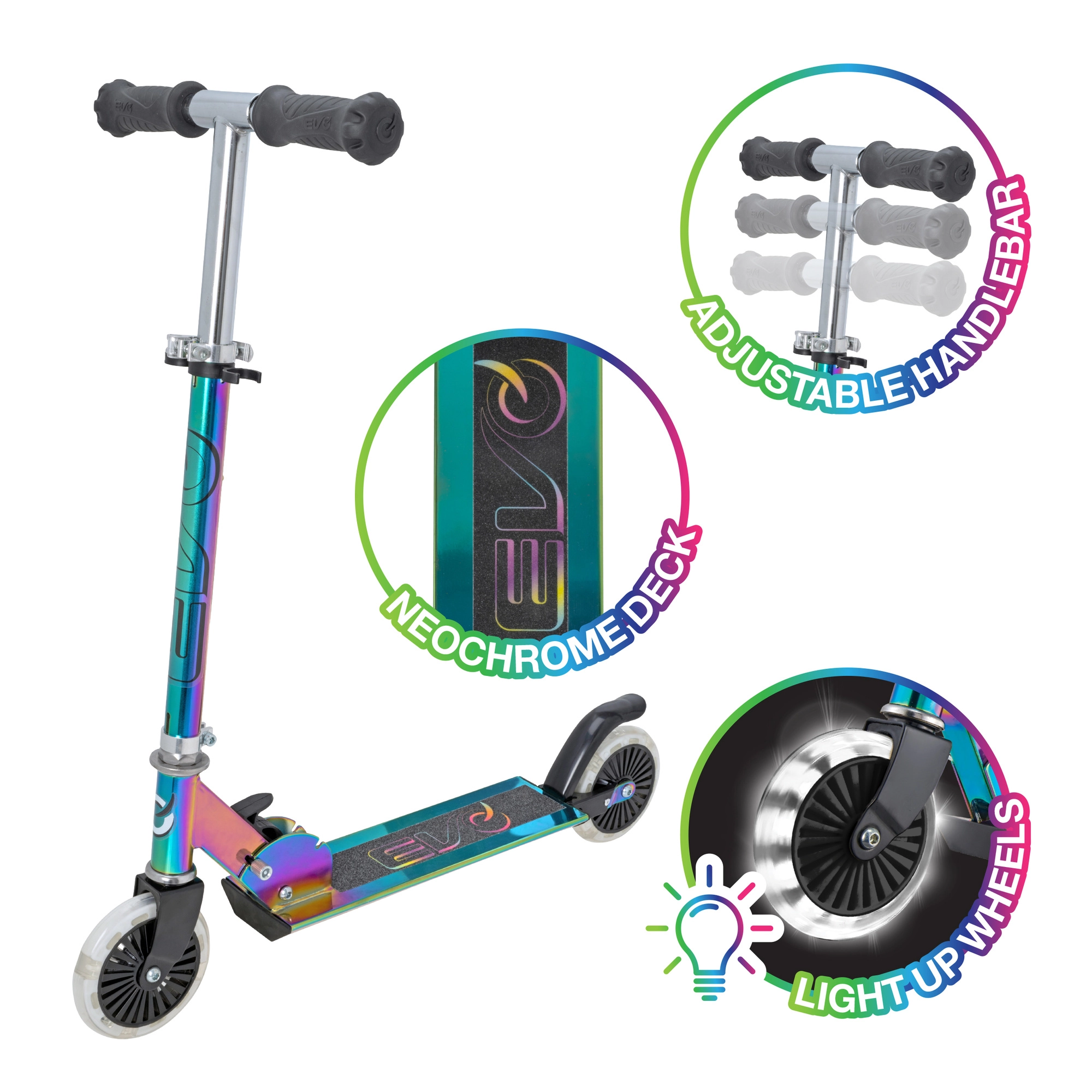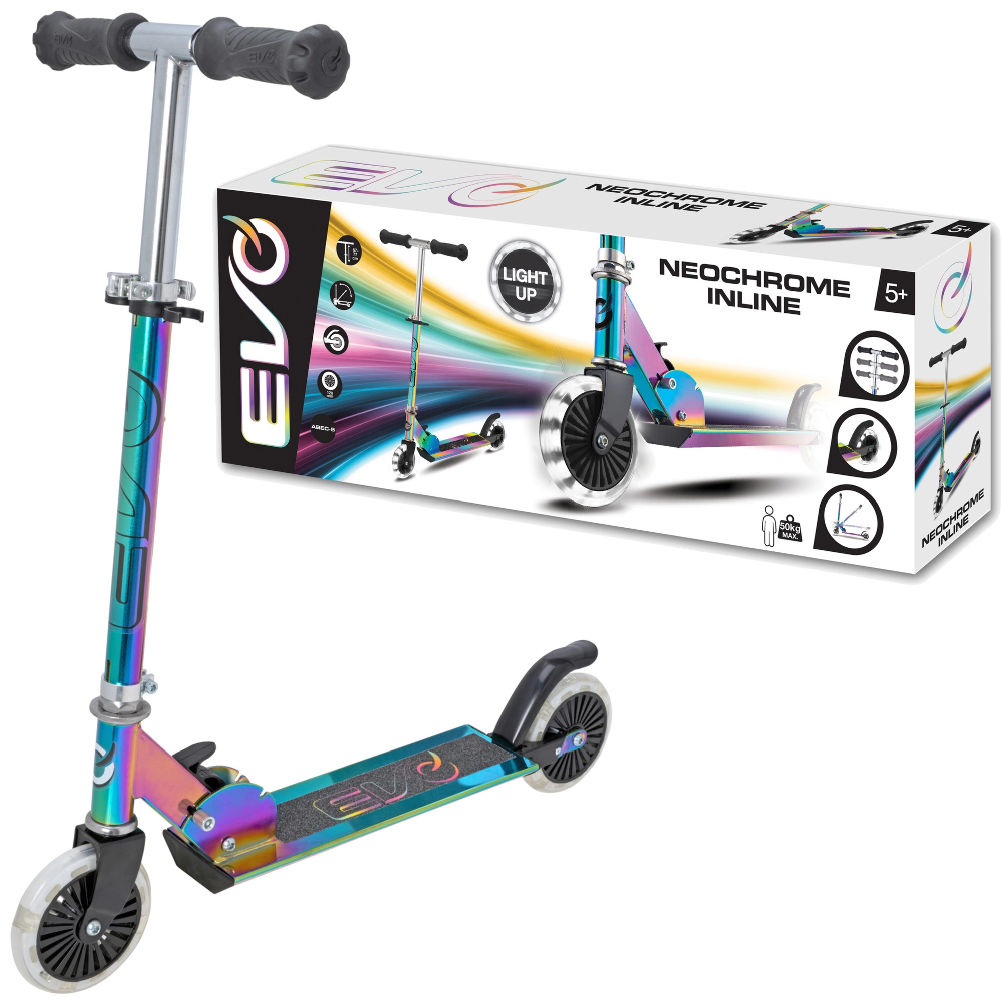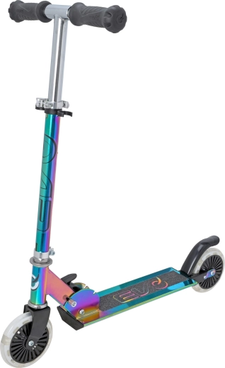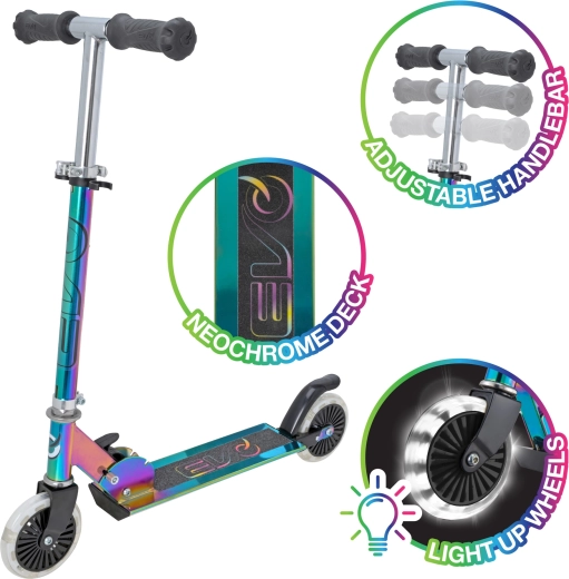 EVO Light Up Neochrome-scooteren er et fremragende valg til små ryttere, der vil skille sig ud. Takket være det justerbare styr (ca. 67–77 cm) vokser den med barnet, foldemekanismen gør transport og opbevaring let, og den holdbare metalkonstruktion med skridsikkert trin giver tryghed under kørslen.