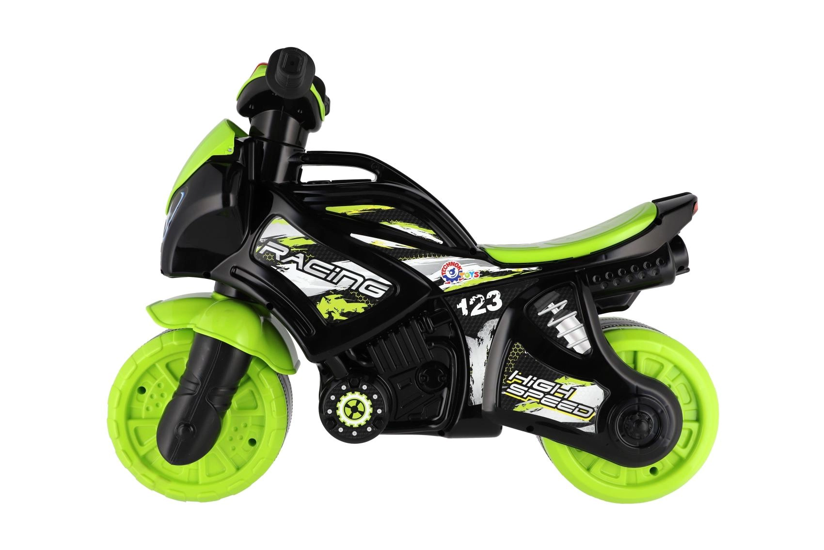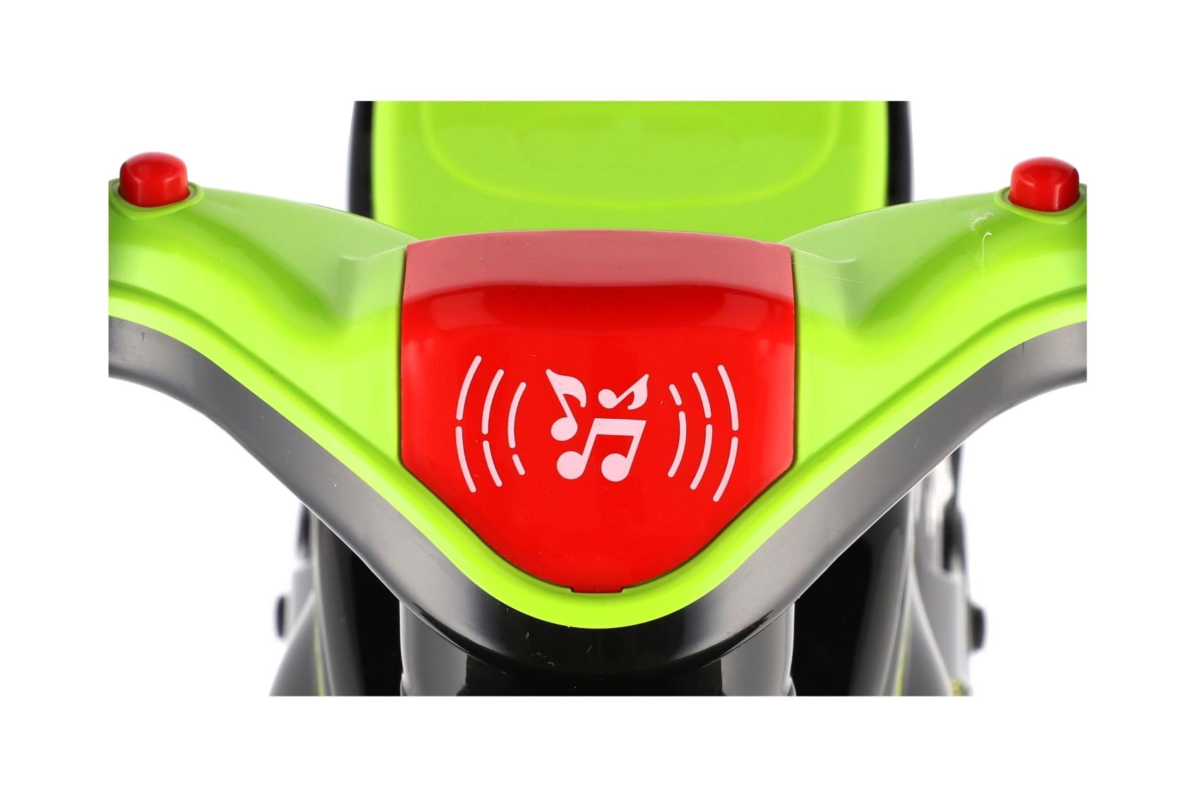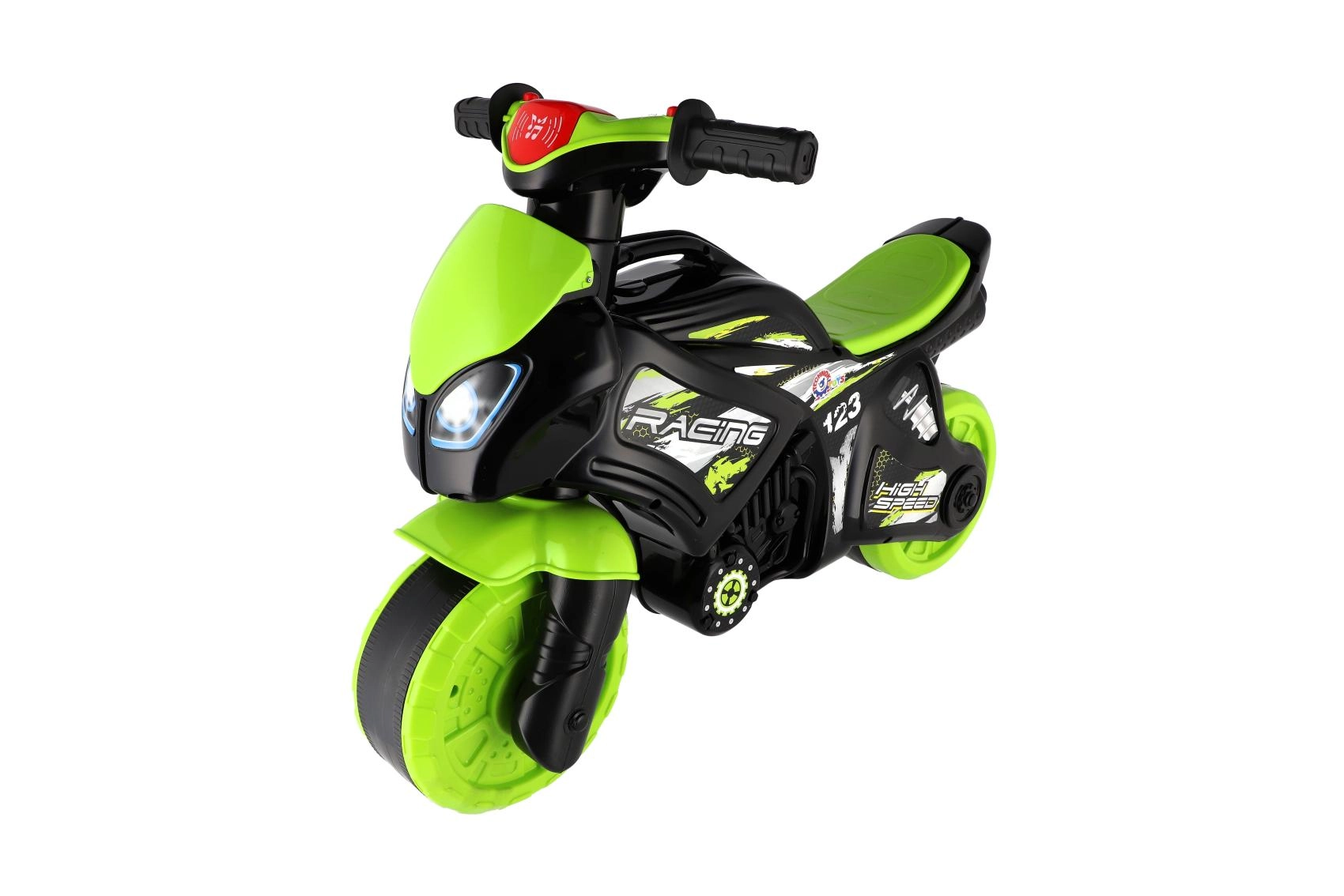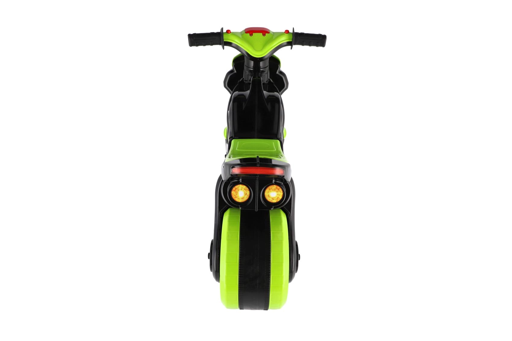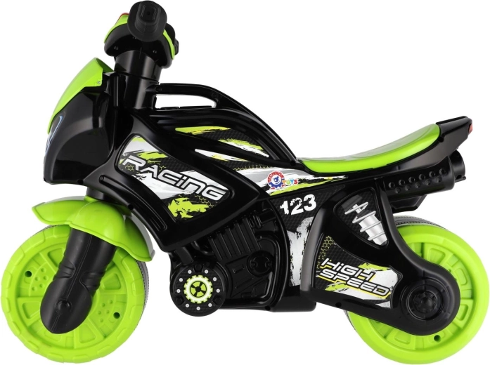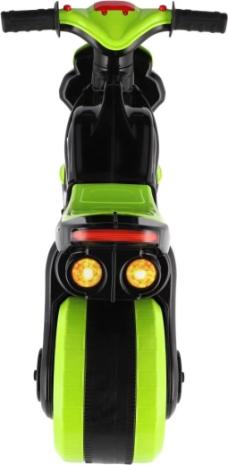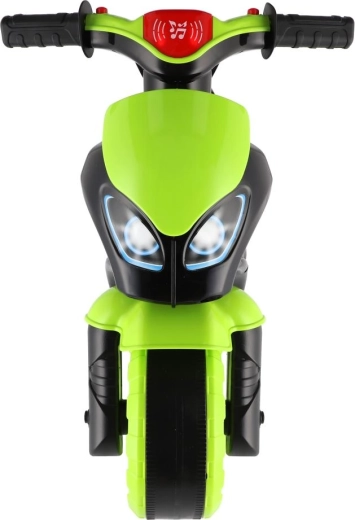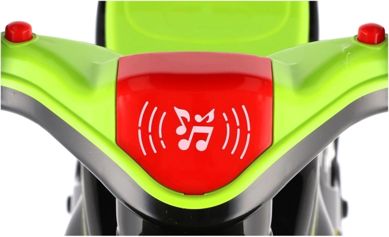 Løbecyklen er udstyret med lys- og lydeffekter, som gør turen mere spændende. Det moderne grøn-sort design med attraktive sportsdekorationer ligner en ægte racermaskine og motiverer børn til aktiv leg.