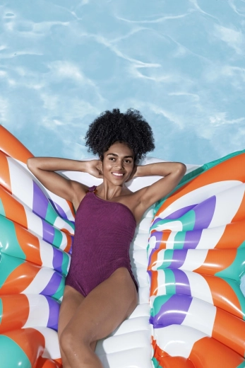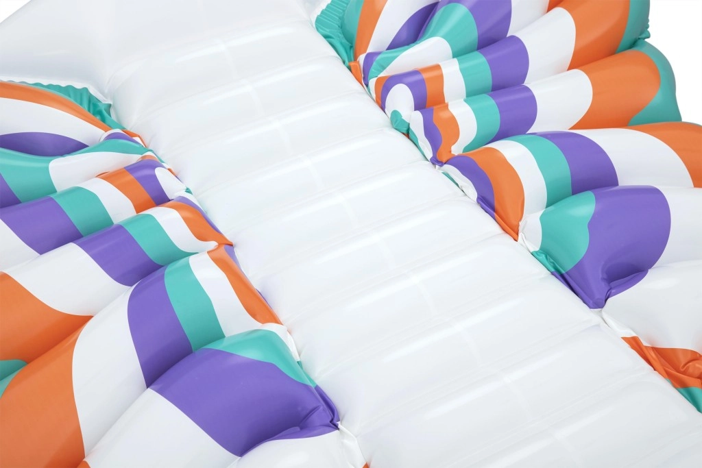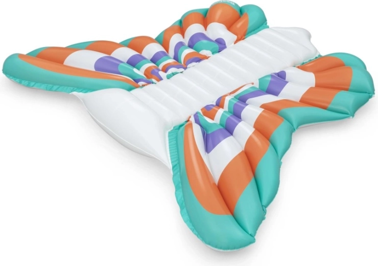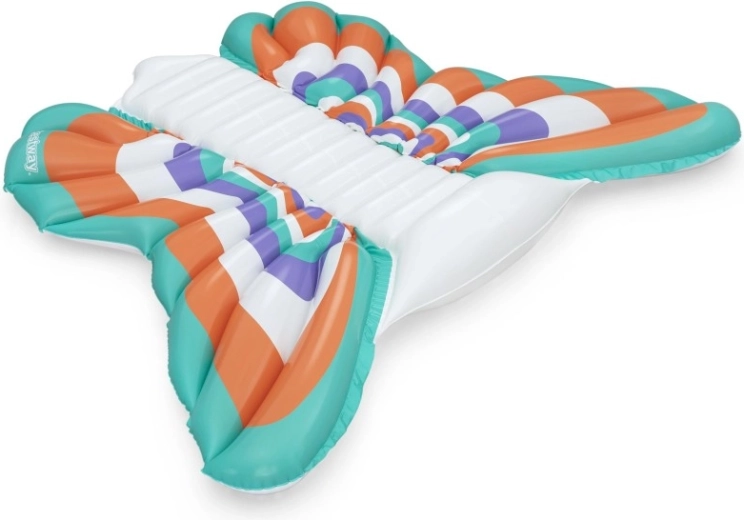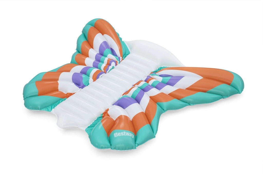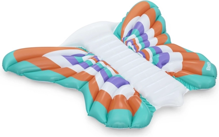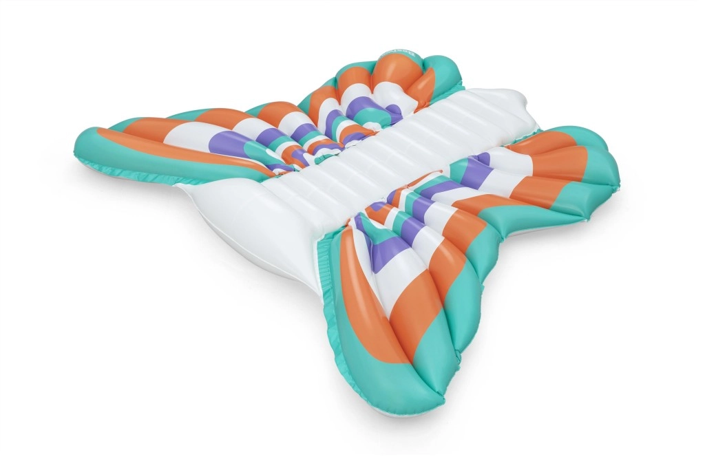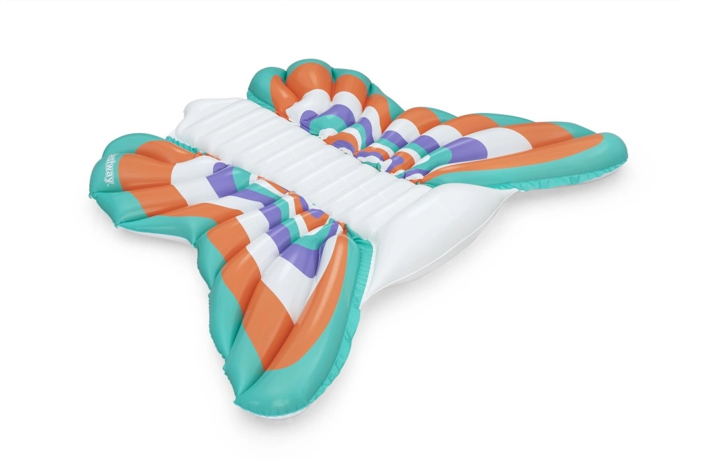 Denne stilfulde oppustelige madras i designet af sommerfuglevinger kombinerer komfort og sjov. Farvede paneler i nuancer af orange, turkis, lilla og hvid giver et iøjnefaldende look, mens den ribbede midterstribe giver behagelig rygstøtte og en afslappet position på vandet.