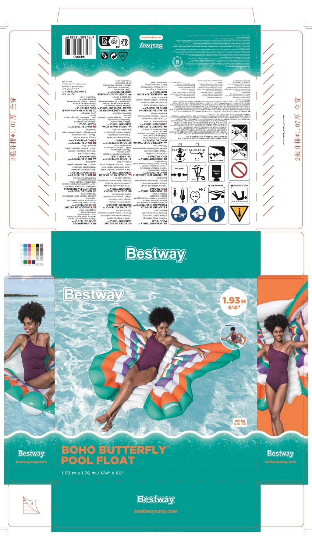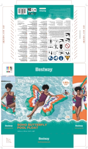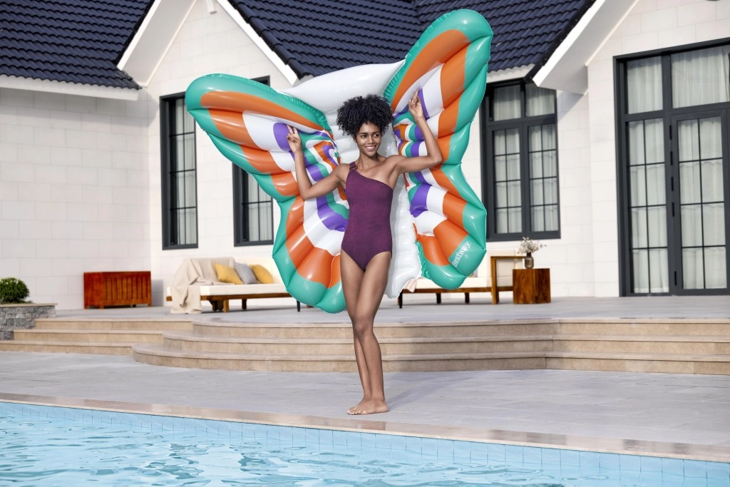 Nyd sommeren på vandet med en oppustelig madras formet som en sommerfugl i målene 193 × 176 cm. Den tilbyder rigelig og behagelig liggekomfort, stabilitet på vandet og holdbart materiale med Color Shield™-teknologi, som bevarer farverne klare og ikke smitter af på våd hud. Med maksimal belastning på 100 kg og hurtig oppustningsventil er den ideel til pool, sø og strand.