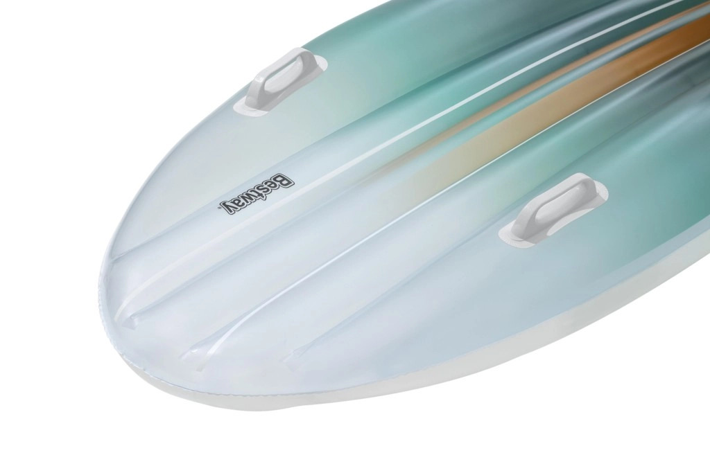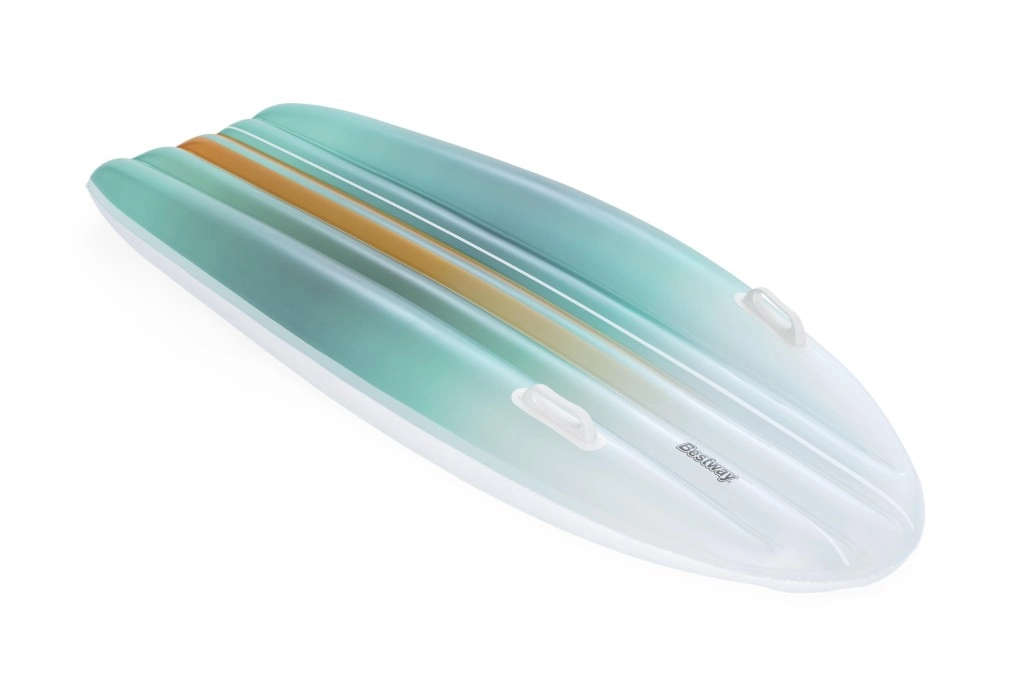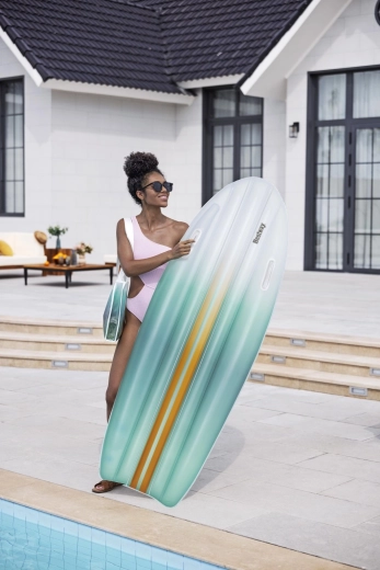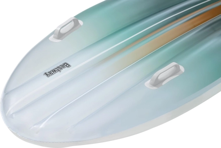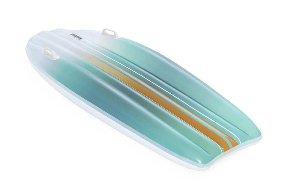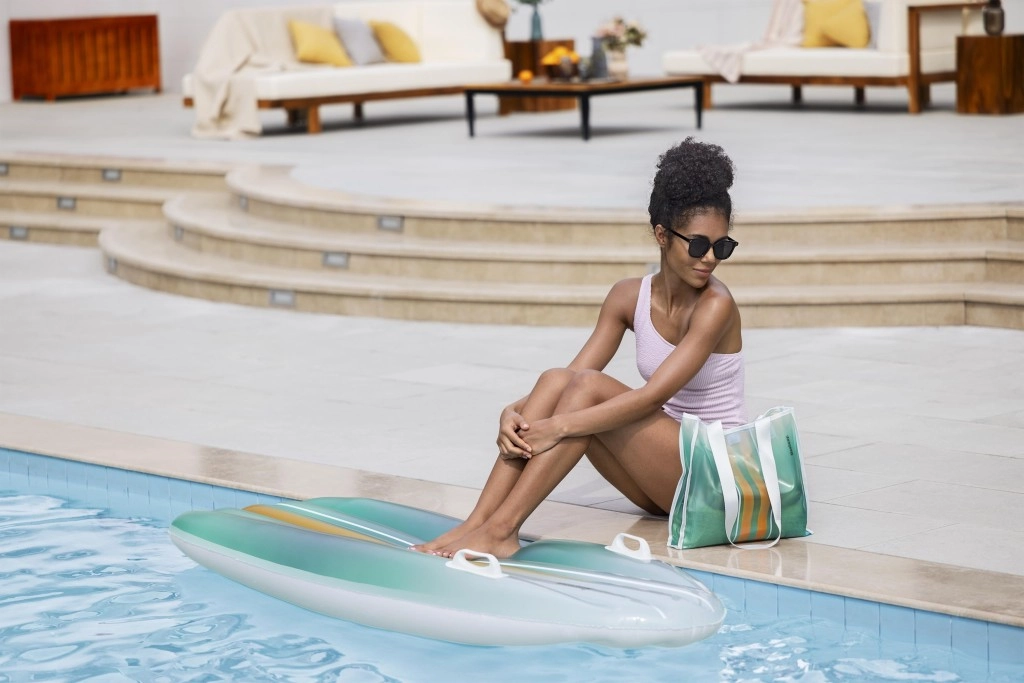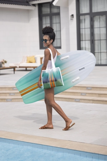 BESTWAY TAHITI-sættet kombinerer praktikalitet og stil til afslappede stunder ved vandet. Luftmadrassen med hydrodynamisk form og to integrerede håndtag giver tryghed ved ombordstigning og under afslapning. Det ensartede cyanfarvede gradientprint på både madras og taske ser friskt og sommerligt ud, så du skiller dig ud ved poolen og på stranden.