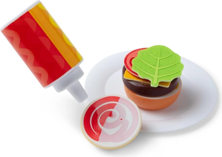 Der medfølger filt-tilbehør og boller, som ved fugt fra sauceflaskerne viser ketchup og sennep for endnu mere realistisk servering. De færdige lækkerier kan serveres på en tallerken, sorteres og lægges i stofposer til at tage med. Lad alt tørre efter legen, så kan der “laves mad” igen og igen – uden batterier og uden rod, kun med vand.