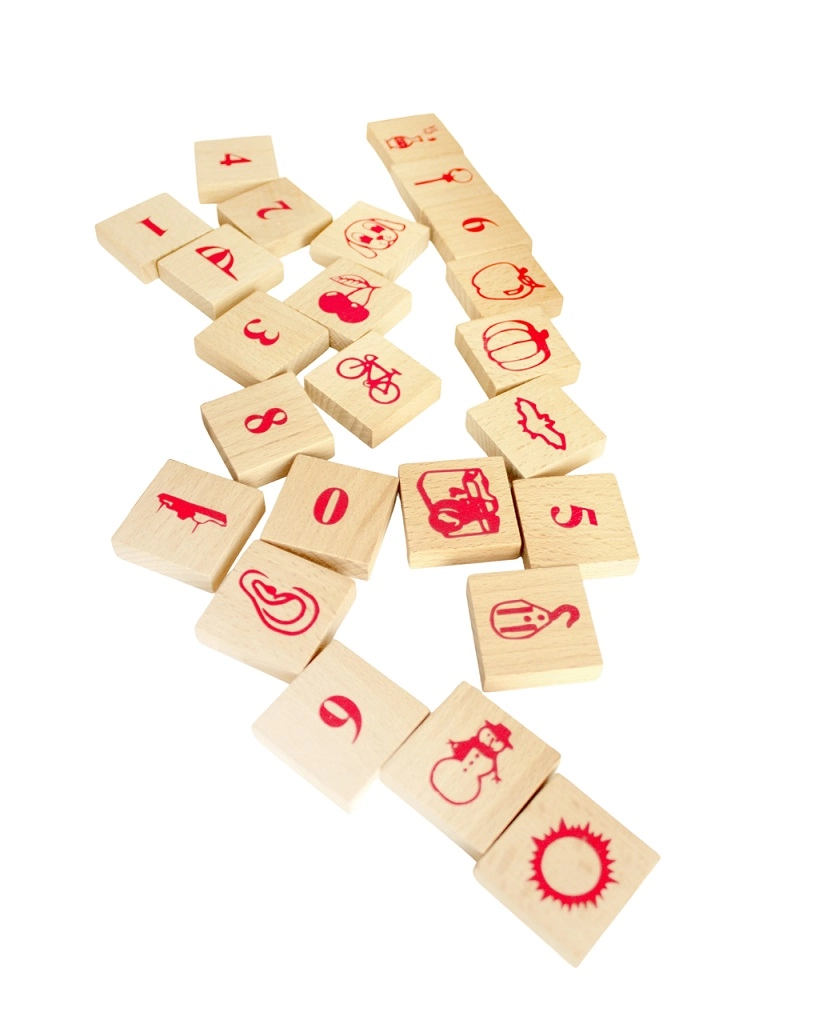Udvalgte klodser med tryk understøtter genkendelse af alfabet, tal og enkle ikoner – perfekt til de første regneopgaver og orddannelse.