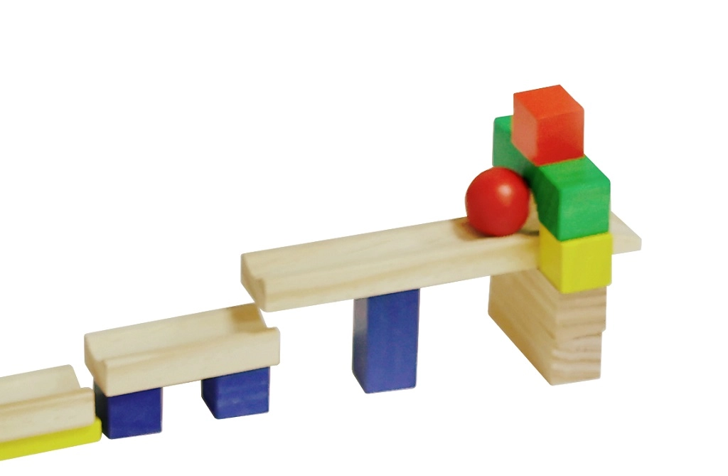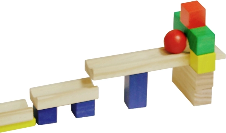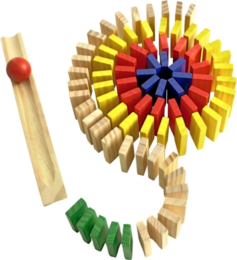 Præcist forarbejdede træklodser og en kugle med rampe sikrer pålideligt fald og en imponerende dominoeffekt uden hakken.