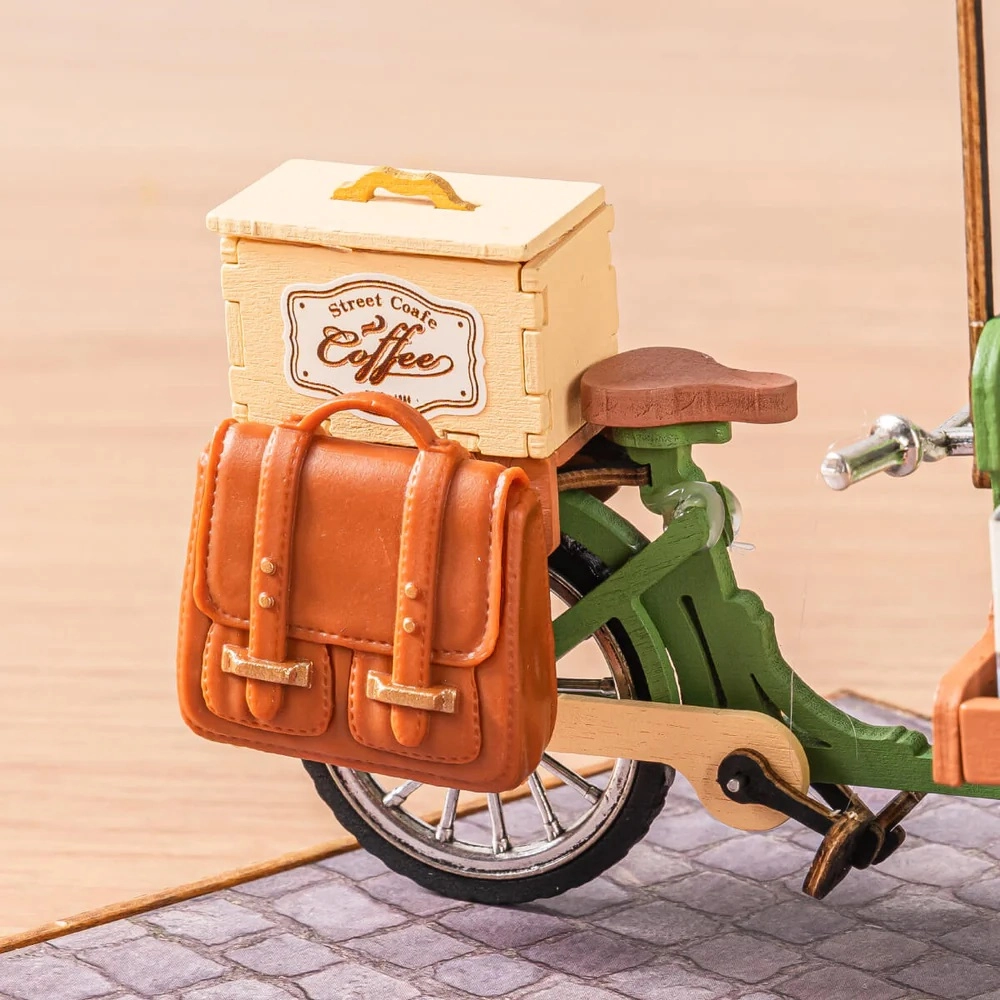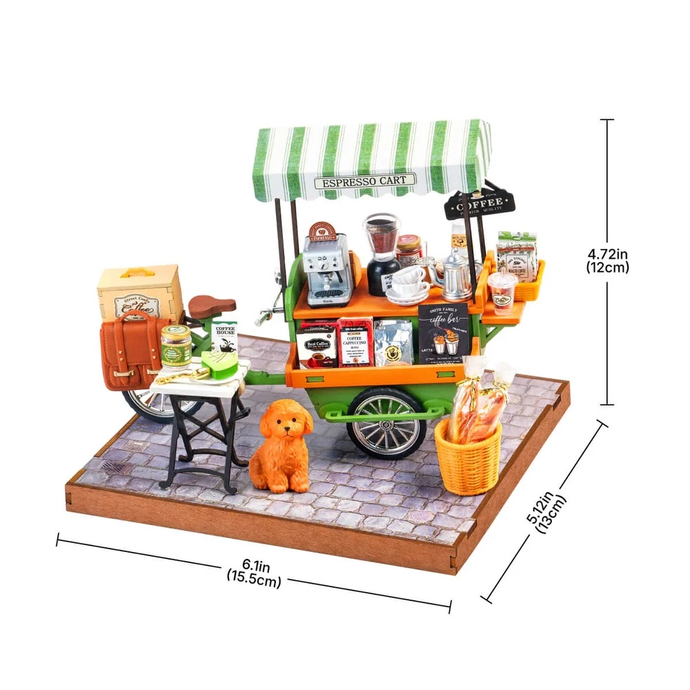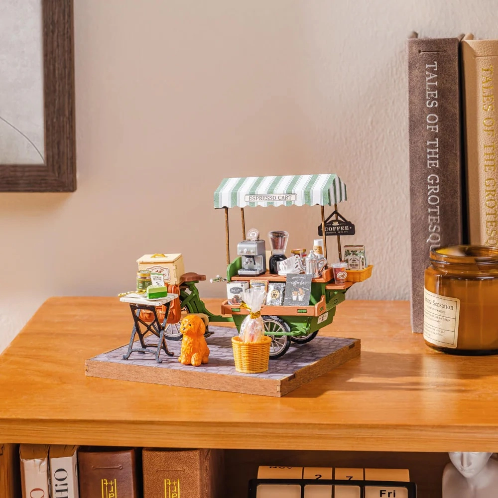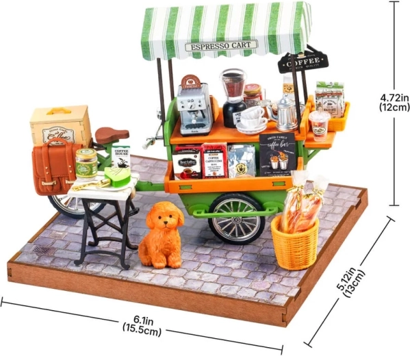 Duften af frisk kaffe og charmen fra gadecaféer – alt i elegant miniature. Kaffevognen, inspireret af den europæiske cafékultur, begejstrer både miniature- og kaffeelskere. Takket være de omhyggeligt udførte detaljer (kaffemaskine, kopper, sirupper, baguetter, bord, hund) virker modellen realistisk og forfiner enhver montre eller arbejdsplads.