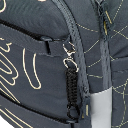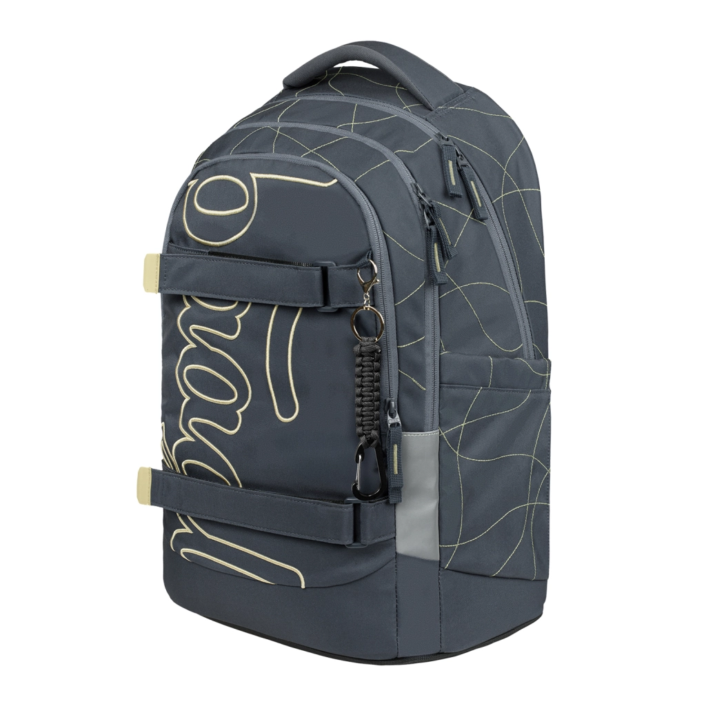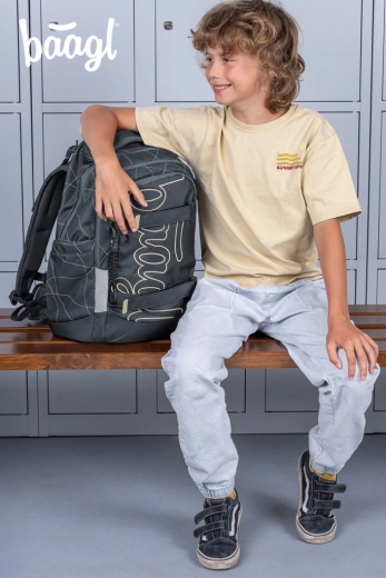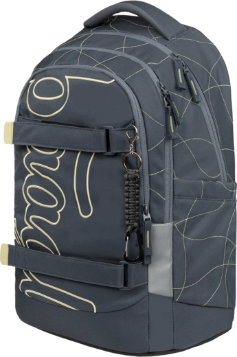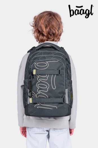Det indvendige rum består af en tre-kammers organizer med en fløjlslomme til laptop, som beskytter elektronik mod ridser. Stive sidelommer rummer BAAGL-drikkeflasker af tritan, frontkompression fastholder en trøje eller skateboard, og et stilfuldt vedhæng giver rygsækken et personligt look.