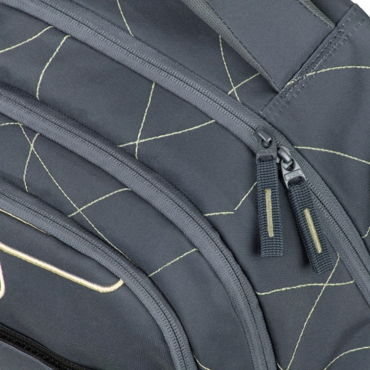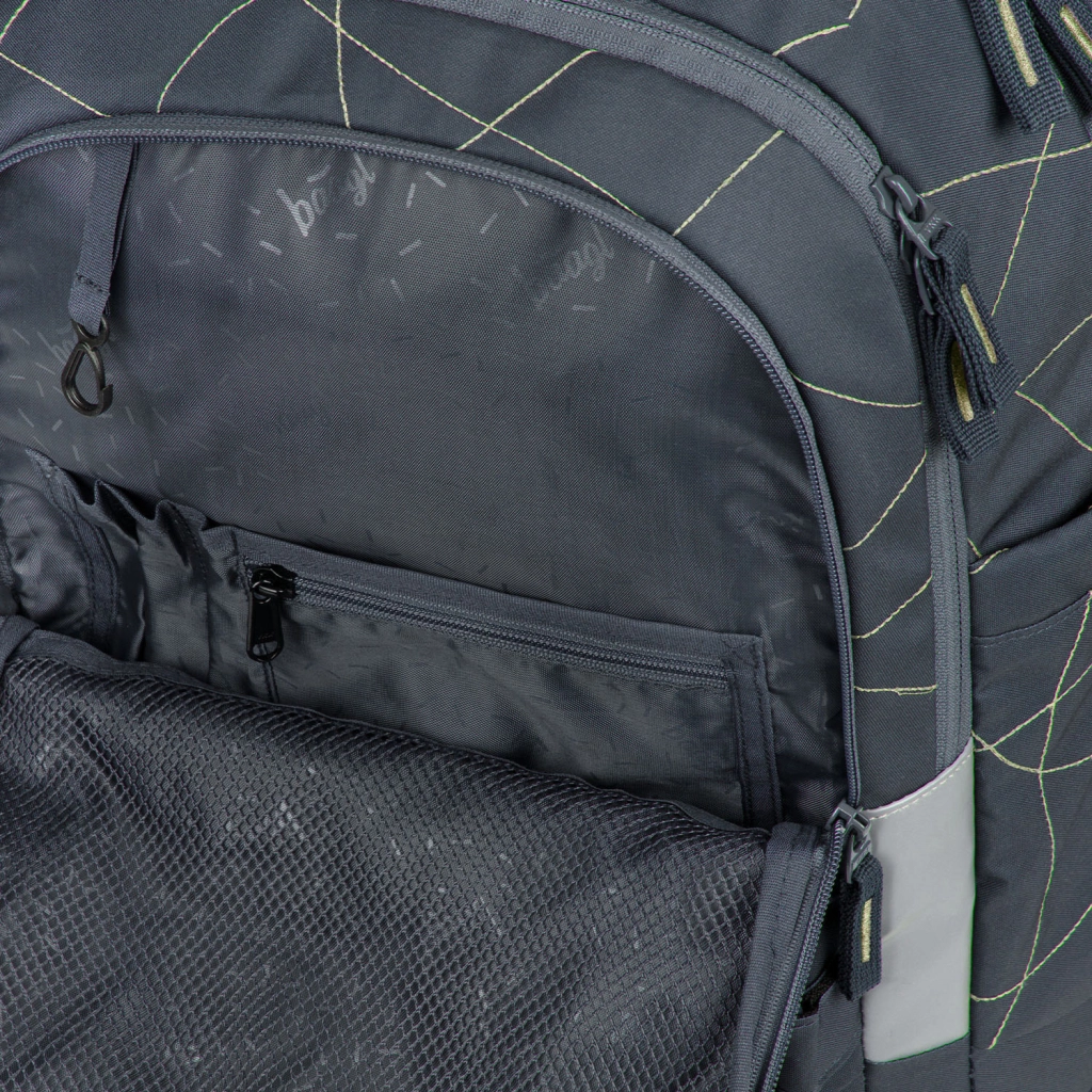 Tredelt indretning, fløjlsblød lomme til bærbar eller tablet og tovejs YKK-lynlåse for hurtig adgang og sikker opbevaring af skoleudstyr.