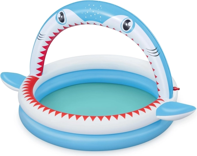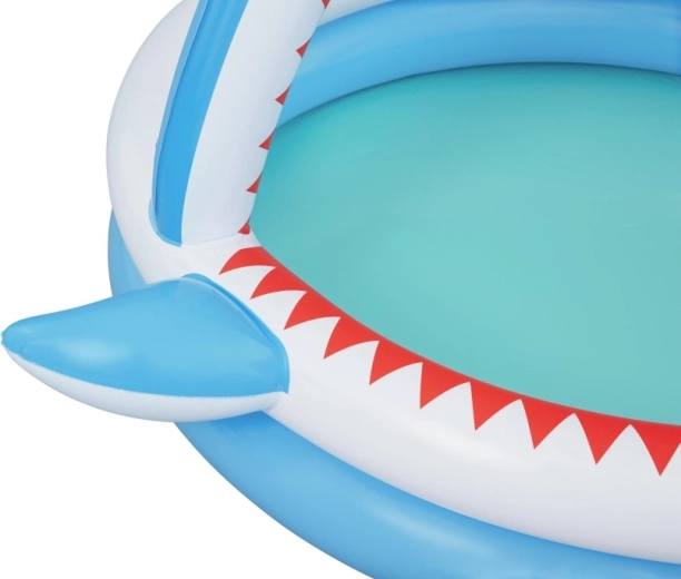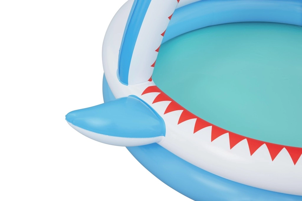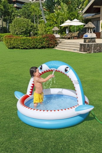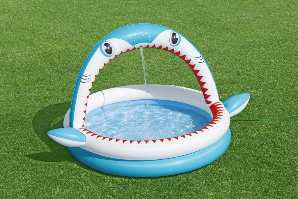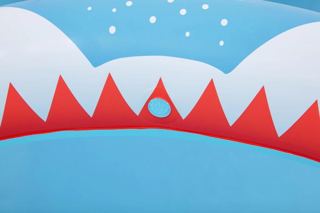 Den buede “hajmund” sprøjter vand, når haveslangen tilsluttes, og forvandler bassinet til en sjov vandlegeplads.