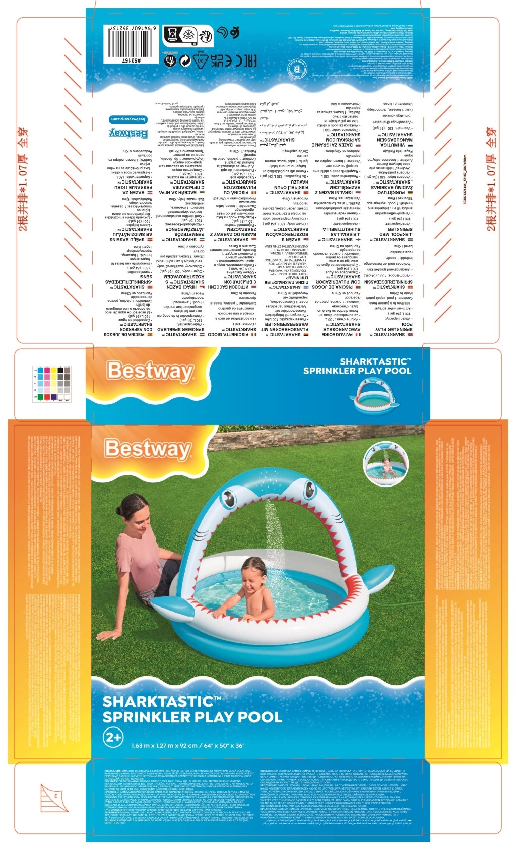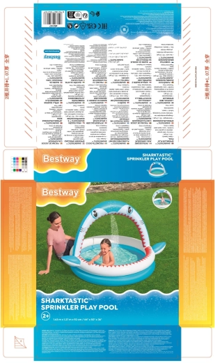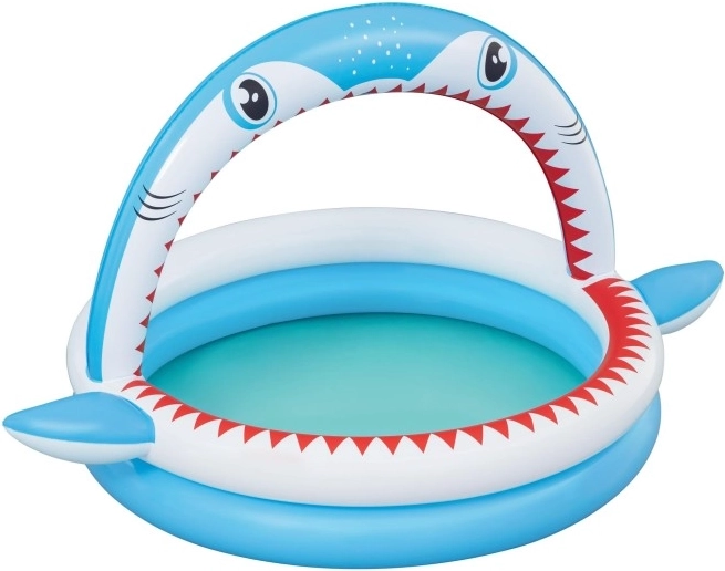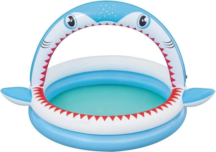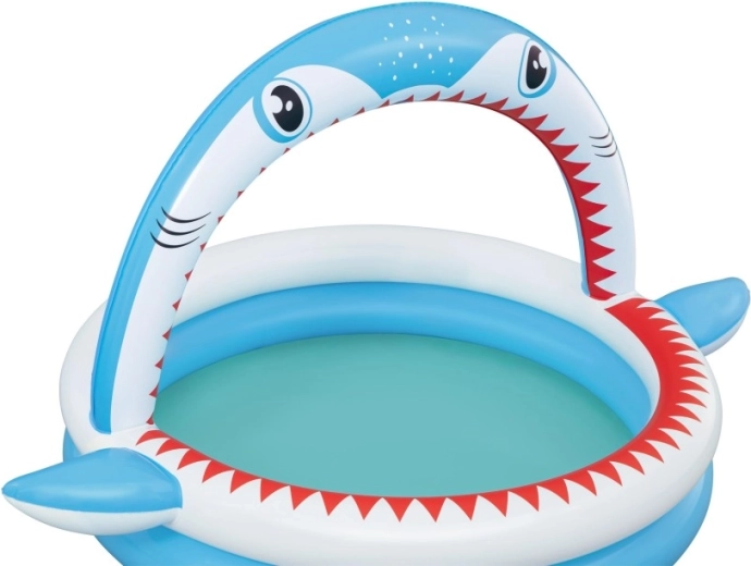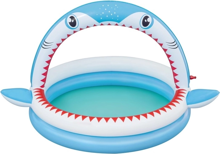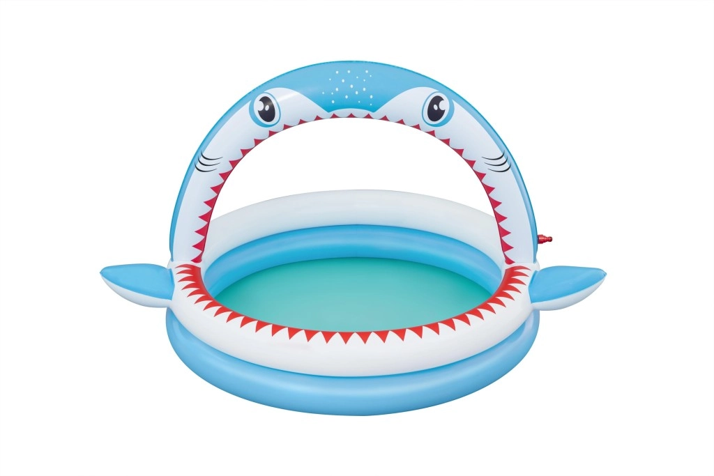 Sjovt oppusteligt bassin formet som en haj med integreret bruser til afkøling på varme dage. Byder på generøse mål 163 × 127 × 92 cm, bløde oppustelige vægge og slidstærkt PVC-materiale. Ideelt til børn fra 2 år, let at puste op, tilsluttes en haveslange og er klar til vandsjov på ingen tid.