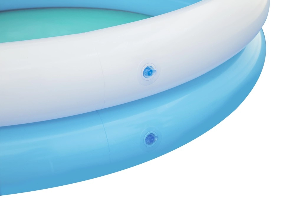 Den stabile oppustelige konstruktion af holdbart PVC og de bløde vægge sikrer komfort og tryghed under legen. Med en kapacitet på cirka 130 l er bassinet ideelt til mindre børn, og takket være praktiske ventiler kan det hurtigt pustes op og tømmes igen. I pakken medfølger en reparationslap for nem vedligeholdelse.