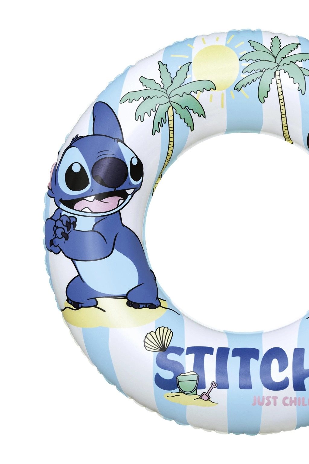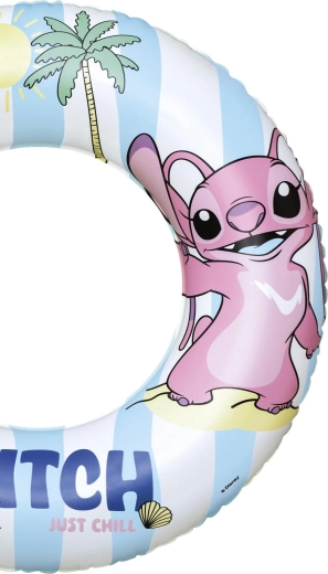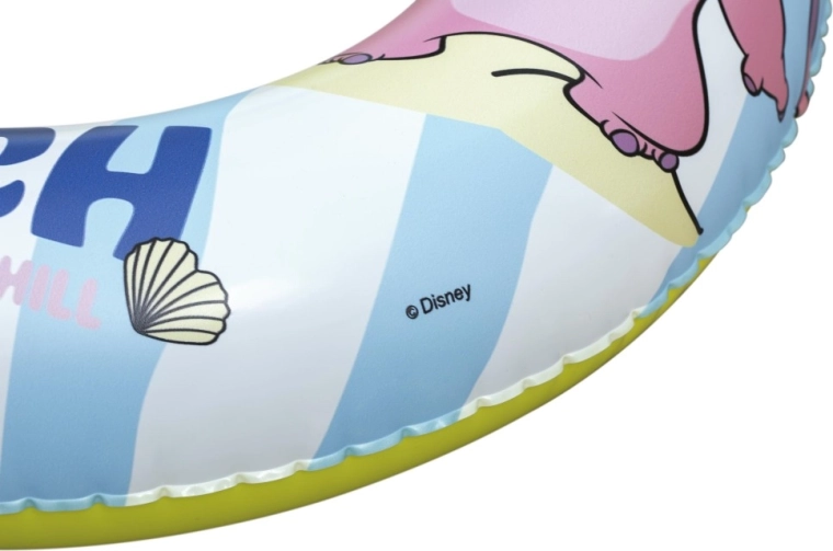 Det stilfulde look i blå-hvide striber med glade illustrationer af Stitch, muslinger og palmer suppleres af en gul underside for bedre synlighed. Den praktiske kontraventil gør det hurtigt at puste op og tømme – ideel til rejser, ferie, svømmehal og hjemme-pool.