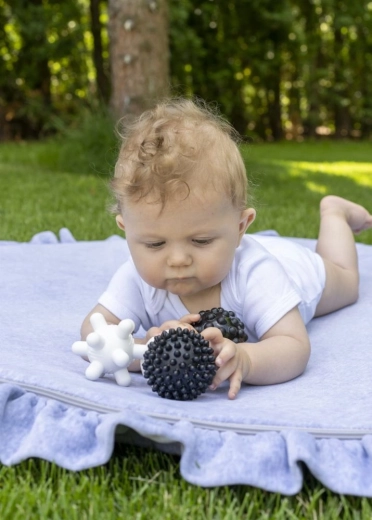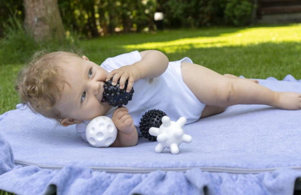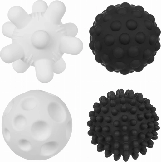 Sættet med sensoriske bolde med en diameter på ca. 6,5 cm motiverer børn til at gribe, klemme og udforske forskellige teksturer. Det kontrastfulde sort-hvide design tiltrækker naturligt spædbørns opmærksomhed og understøtter udviklingen af synet samt øje-hånd-koordination.