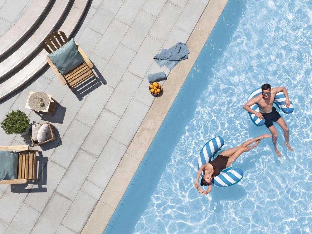 Den premium overflade er blød at røre ved, behagelig mod huden og ideel til langvarig afslapning ved vandet. Samtidig er den slidstærk og nem at vedligeholde.