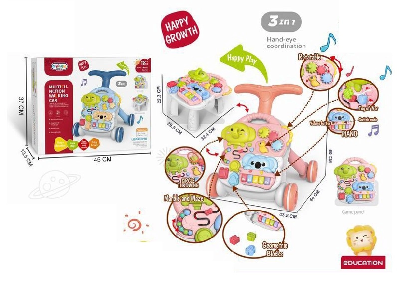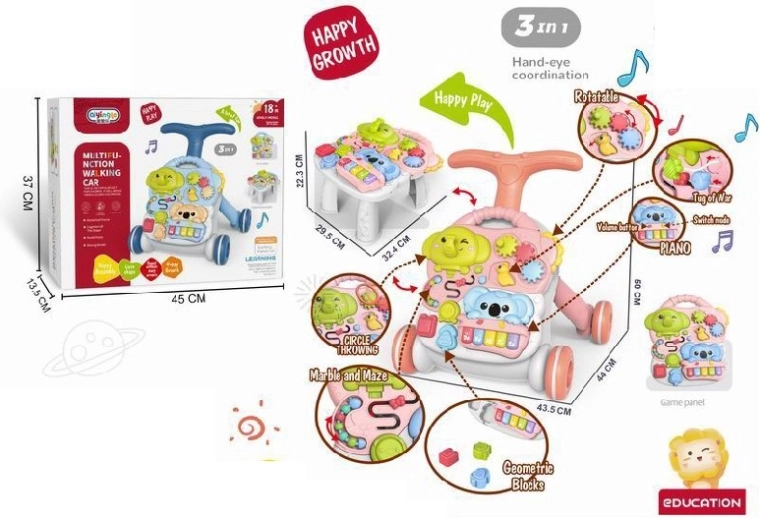 Den multifunktionelle gåvogn og læringsbord 3 i 1 støtter dit barns naturlige udvikling fra 12 måneder. Den tilbyder et gåstativ, et bord og et aftageligt interaktivt panel med klaver og elementer, der udvikler motorik, sanser samt genkendelse af former, farver og lyde. Takket være den stabile konstruktion, muligheden for at fylde benene med vand eller sand og skridsikre hjul med lås er legen sikker og jævn.