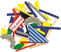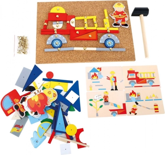 Dette kreative byggesæt med brandmandstema begejstrer alle små byggere. Med det store udvalg af farvede træformer kan børn skabe brandbiler, stationer og deres egne historier. Den enkle fastgørelse på korkpladen er intuitiv og sikker, og udvikler samtidig finmotorik og øje–hånd-koordination på bedste vis.