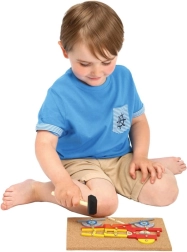 Børn placerer delene og banker dem forsigtigt fast med hammeren. Legen styrker øje–hånd-koordination, tålmodighed og præcision.