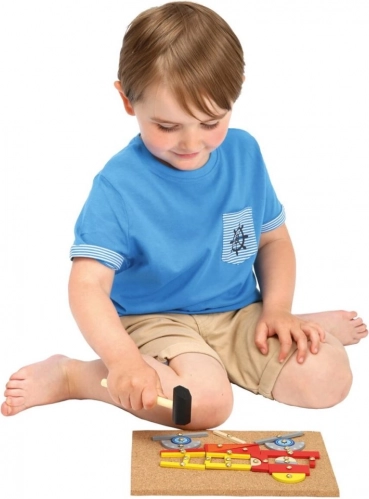 Sættet indeholder korkplade, hammer, små søm og forskellige træformer – alt til sikker og gentagen leg og byggeri.