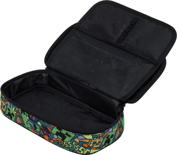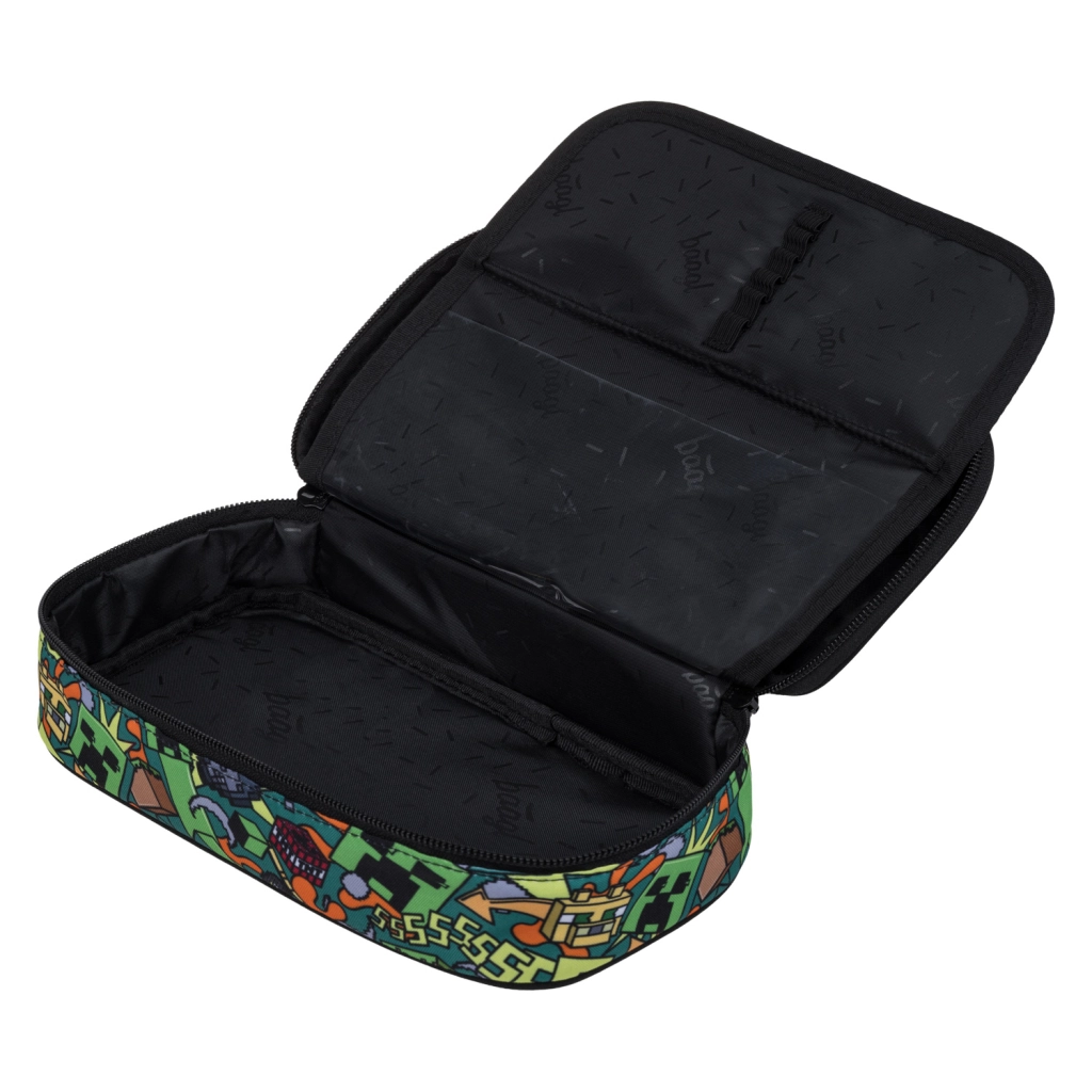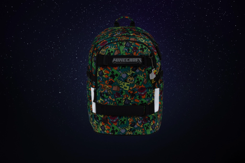 Penalhuset med dobbelt udklap giver overskuelig opbevaring af skriveredskaber, har en indvendig lomme og vindue til skema. Posen i stærkt, aftørringsvenligt materiale snøres med snore, som også muliggør bæring på ryggen. Hele sættet matcher i et energisk gaming-design MINECRAFT Chaos og benytter holdbare YKK-lynlåse og genanvendte materialer.