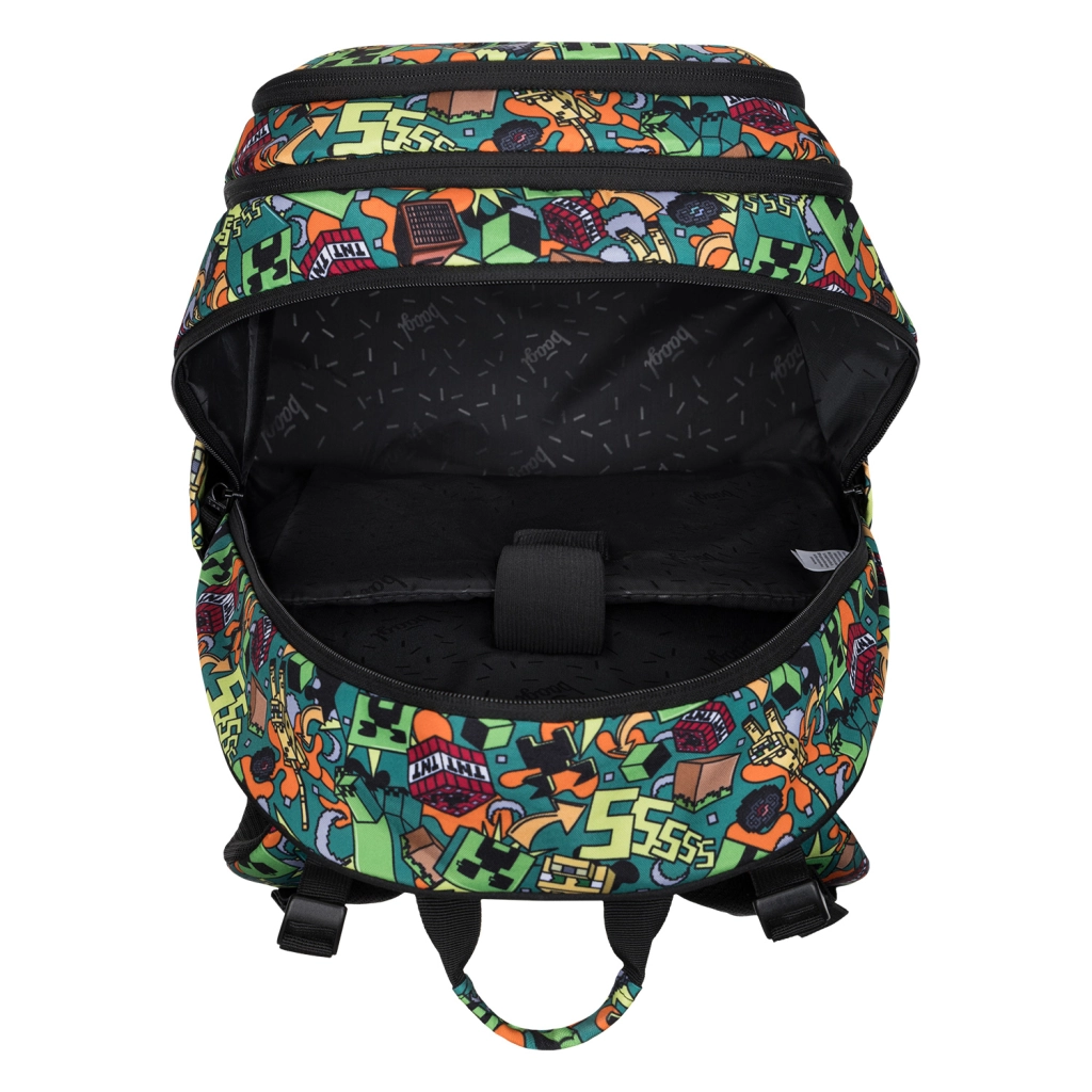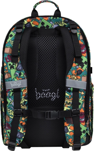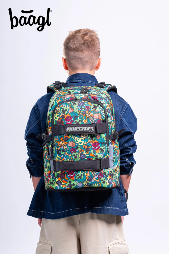 Skolesættet BAAGL Skate MINECRAFT Chaos er designet til komfortabel hverdagsbrug fra 3. klasse. Rygsækken vejer op til 900 g og tilbyder tre rum, indvendig organizer og polstret lomme til 15" laptop eller tablet. Takket være anatomisk formet ryg, fuldt justerbare kompressionsstropper og refleksdetaljer egner den sig til både skole og fritid.