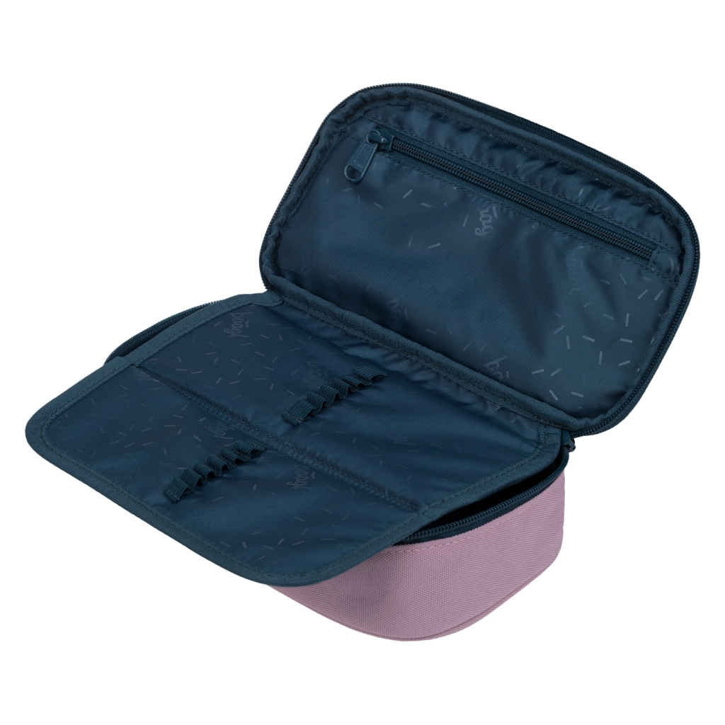 Stilfuldt og robust skolepenalhus Baagl Rose med GRS-certificering tilbyder en rumlig hovedlomme, en dobbelt udklapningsflap og praktisk inddeling for perfekt organisering. Takket være YKK-mærkelynlåse og solide træk er penalhuset maksimal pålideligt, fremstillet af genanvendt materiale skånsomt for naturen. Leveres uden indhold.