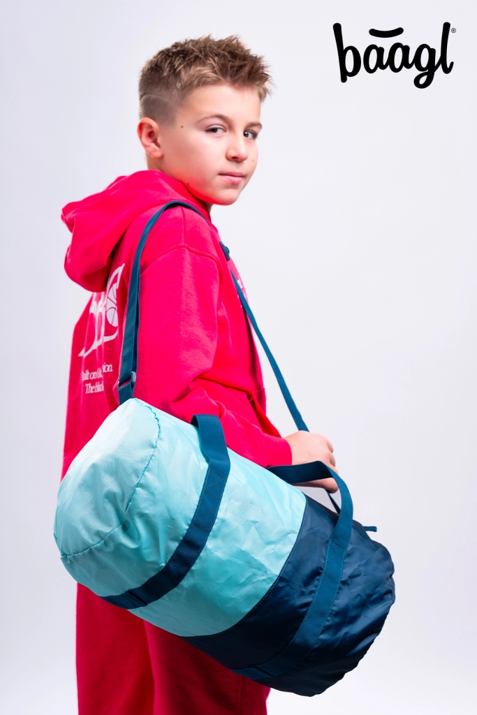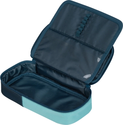 Sættet suppleres af et kompakt penalhus med dobbeltsidet udklap og skema-vindue, en sammenfoldelig sportstaske med volumen 22 l og vægt blot 170 g, en praktisk bæltetaske til småting og et laptopcover til beskyttelse af udstyr. Alt i et matchende petrol/turkis design for et ensartet udtryk.