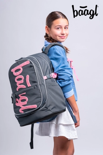 Stilfuldt skolesæt BAAGL Core Logo i pink indeholder en rygsæk med anatomisk ryg og lomme til 15'' laptop, et rumligt penalhus, en let gymnastikpose, en praktisk bæltetaske og et laptopcover. Fremstillet af genanvendte og vandafvisende materialer, med kvalitetslynlåse fra YKK, reflekselementer og ergonomisk bærekomfort fra 3. klasse. Certificeret Global Recycled Standard (GRS).