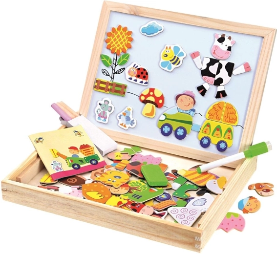 Alle disse kreative værktøjer og dele gemmes i en trækasse, som er let at transportere. Børnene vil nyde mange timer med denne bondegårdstavle og udvikle deres fantasi og færdigheder.