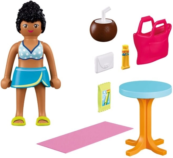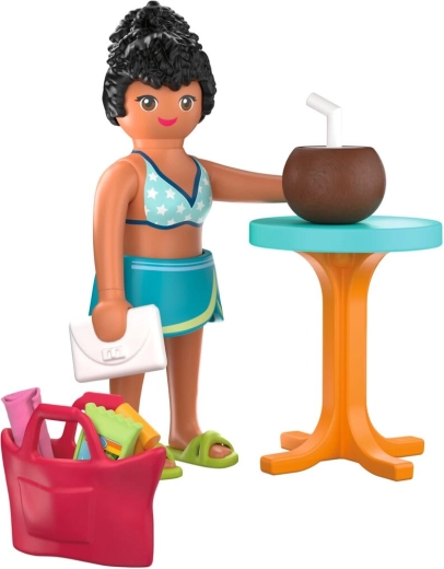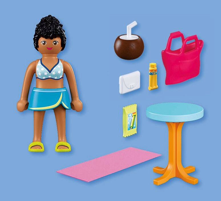 - Figur af feriegæst (~7,5 cm), nederdel, håndtaske, et par sandaler, bardisk, kokos-cocktail, strandtaske, strandhåndklæde, solcreme, ispind og andet tilbehør