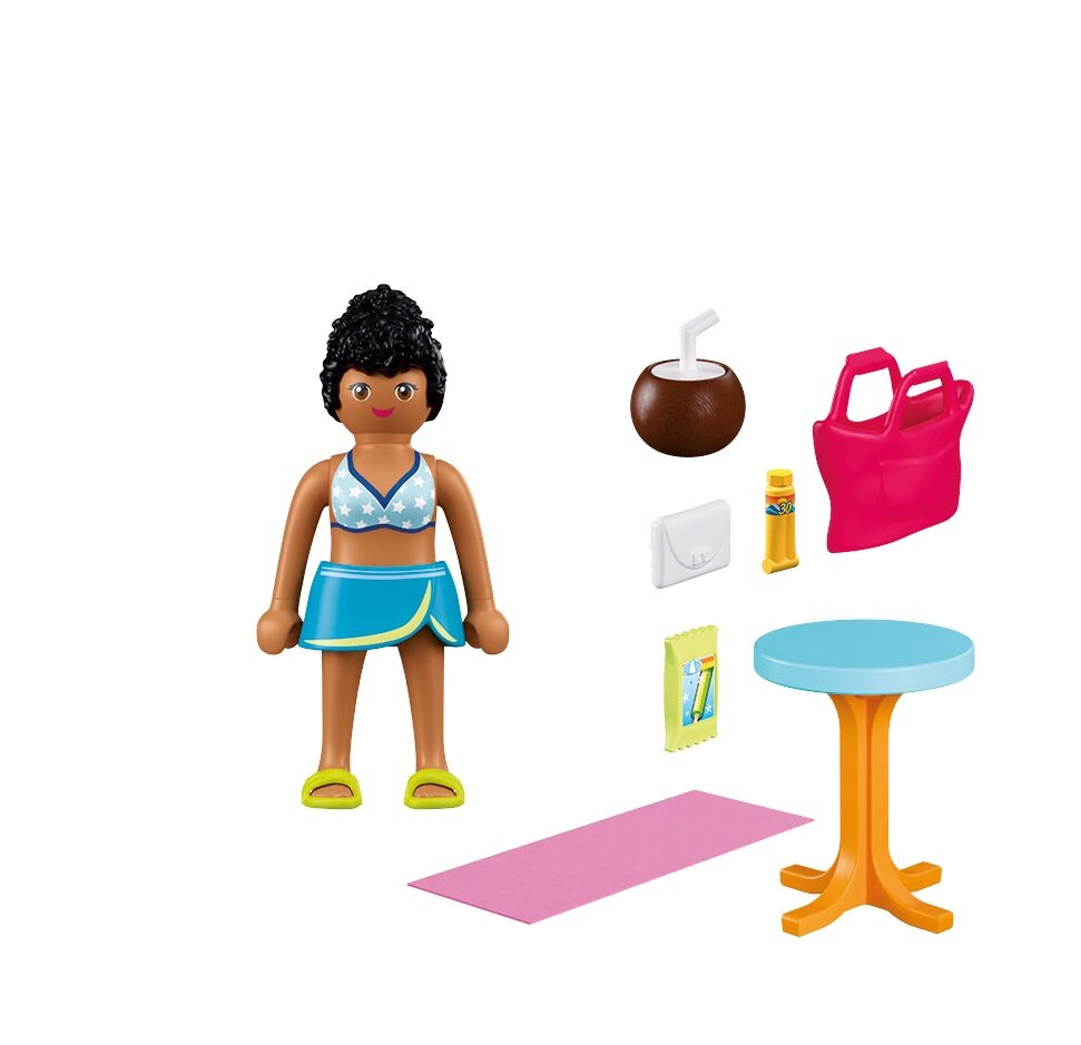 Dette lille, men gennemtænkte sæt fra PLAYMOBIL bringer sommerstemningen direkte ind på børneværelset. Figuren af feriegæsten (ca. 7,5 cm) har stilfuldt tilbehør og udstyr til afslapning efter en dag fuld af strandoplevelser – fra kokosnød til en forfriskende snack.