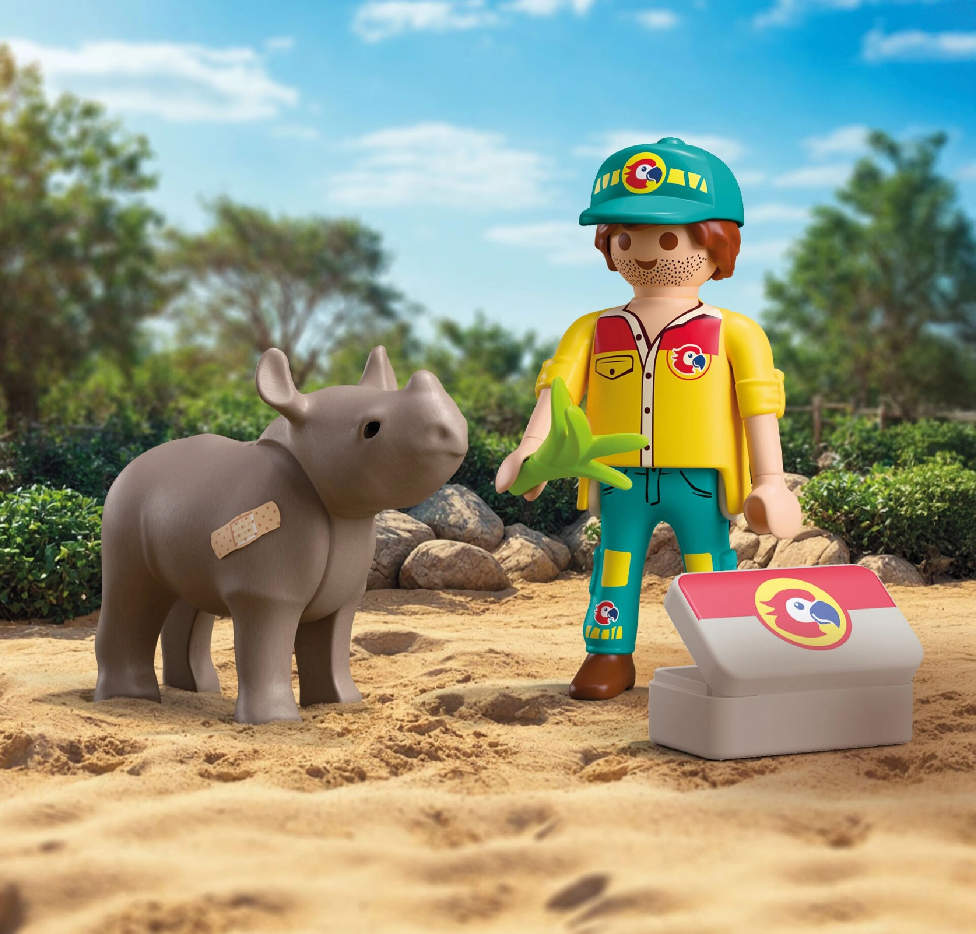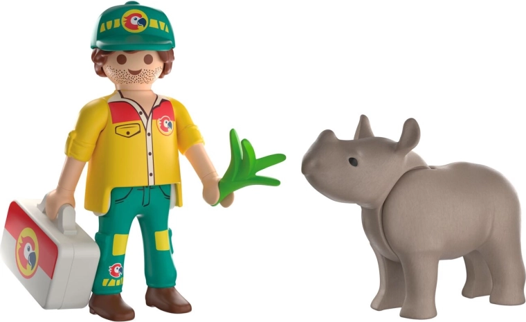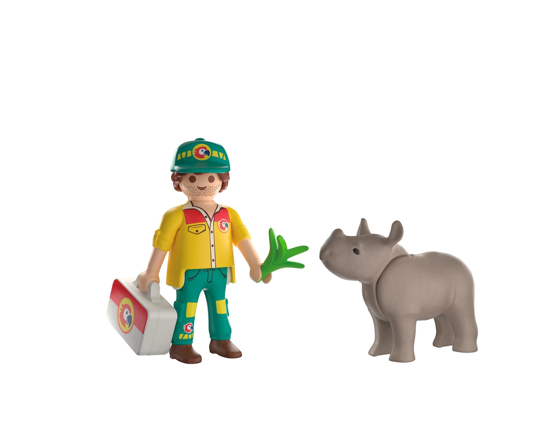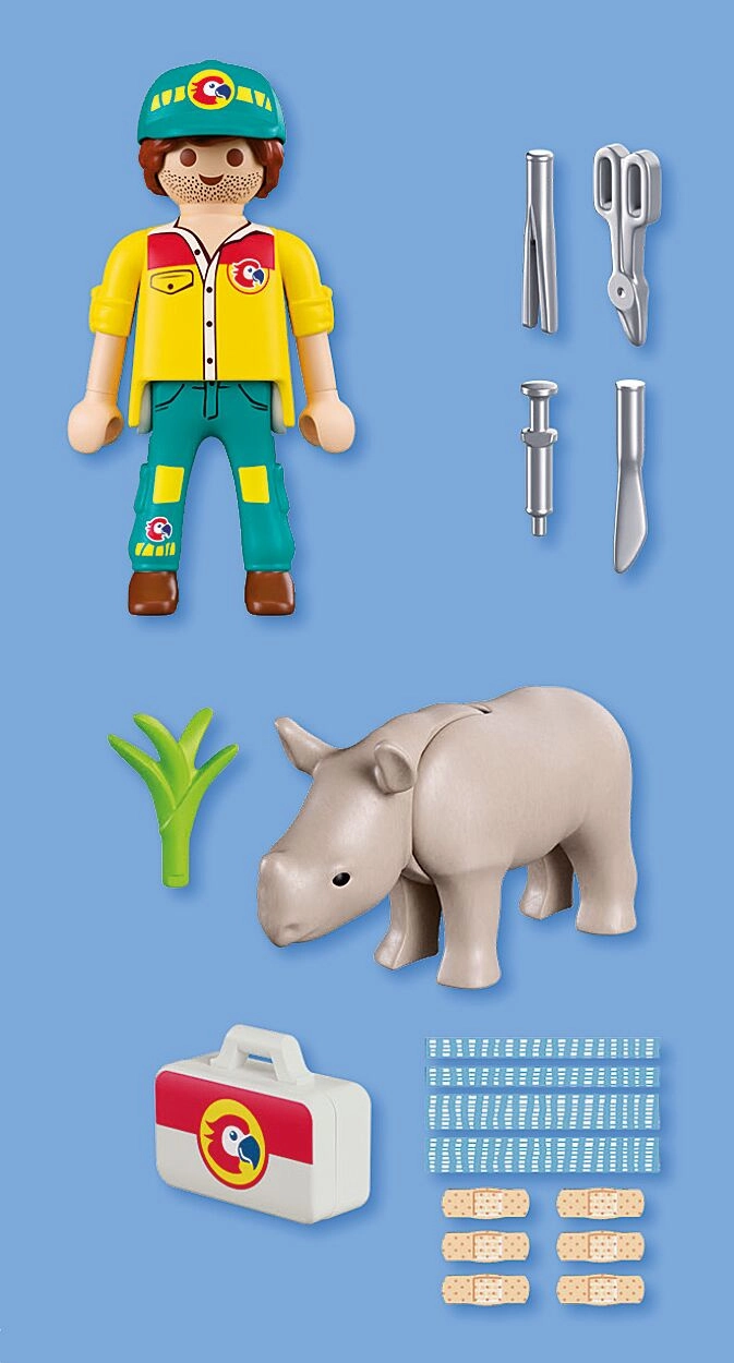 - Dyrepasserfigur, næsehornsfigur, lægetaske, sæt lægeredskaber, ark med klistermærker med plastre og forbindinger, plante-del