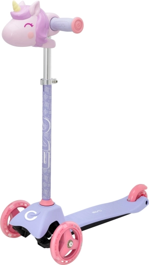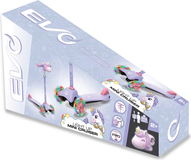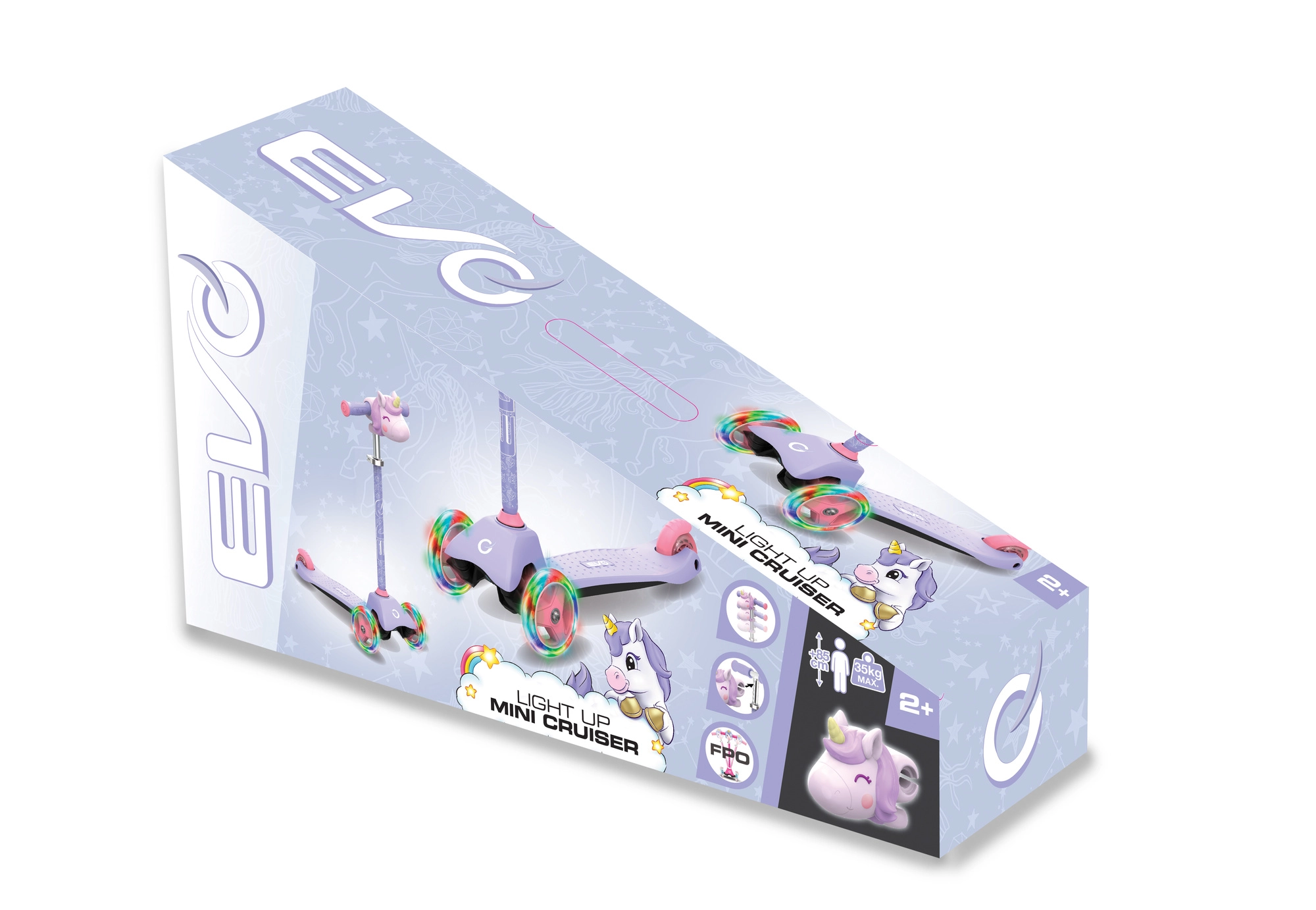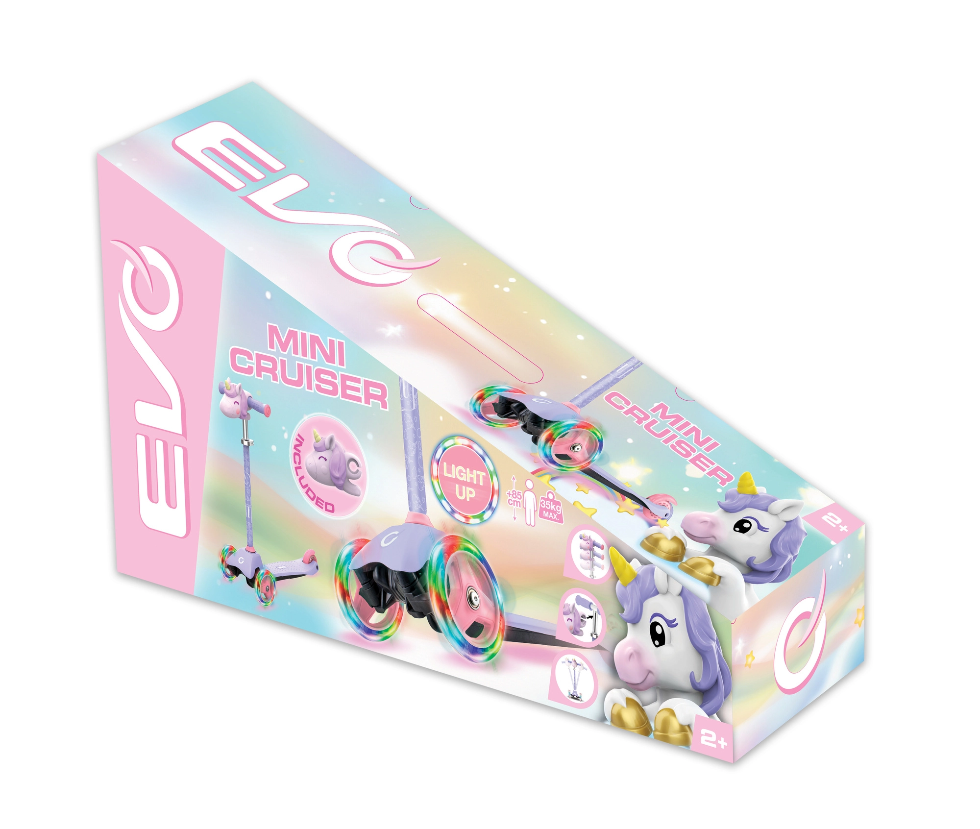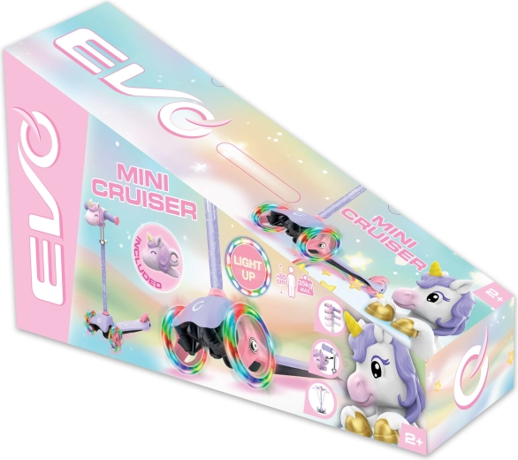 Det trehjulede børneløbehjul EVO Light Up Mini Cruiser med enhjørningemotiv vil glæde små ryttere allerede fra 2 år. Det tilbyder stabile tre hjul, bredt, lavt trinbræt, justerbart styr og lysende forhjul for endnu sjovere kørsel. Takket være balancestyring ved hældning udvikles balance og koordination, mens den bageste fodbremse sikrer sikker standsning.