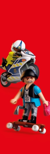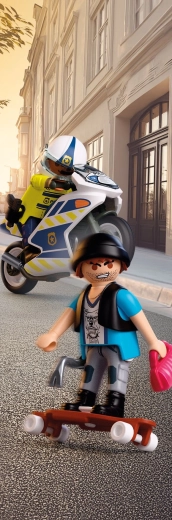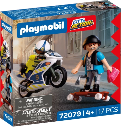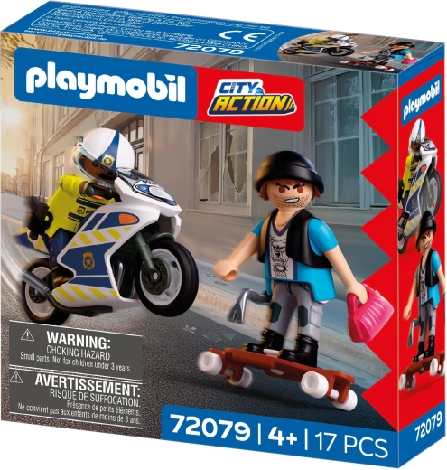 Sæt gang i spændende action i byen med legesættet PLAYMOBIL City Action. En politibetjent på motorcykel forfølger en tyv på skateboard og forsøger at få den stjålne håndtaske tilbage. Sættet indeholder 2 figurer, en politimotorcykel, longboard/skateboard og masser af autentisk tilbehør til realistisk rolleleg.