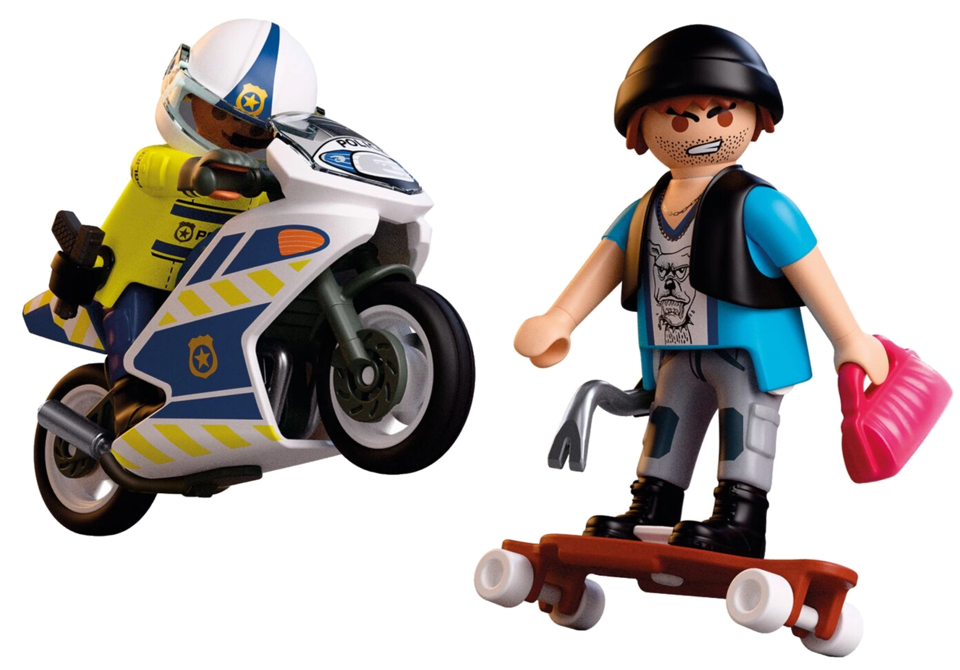 - Indhold i sættet: 2 figurer (politibetjent og tyv, ca. 7,5 cm), politimotorcykel, skateboard/longboard, hjelm, handsker, hylster, pistol, kasket, håndtaske, holder og brækjern.