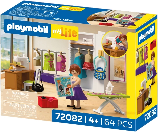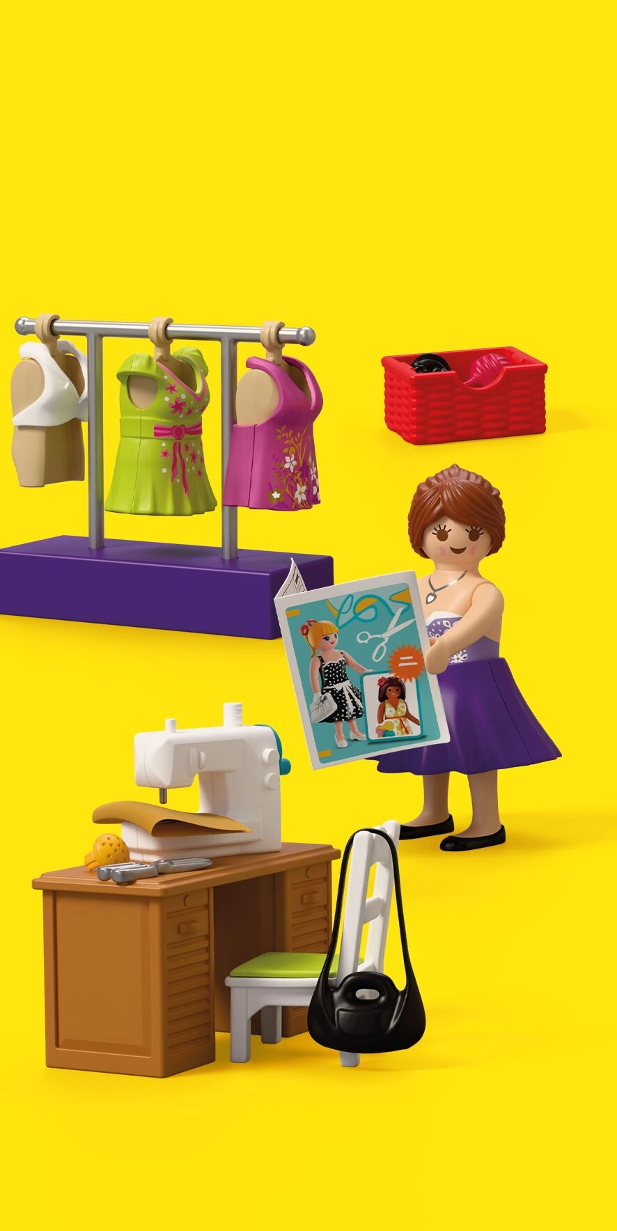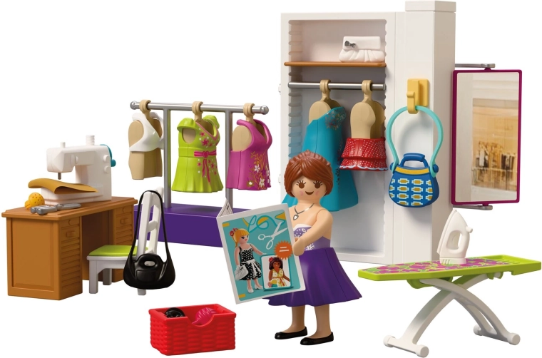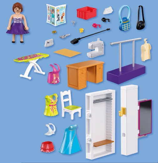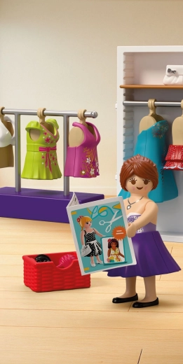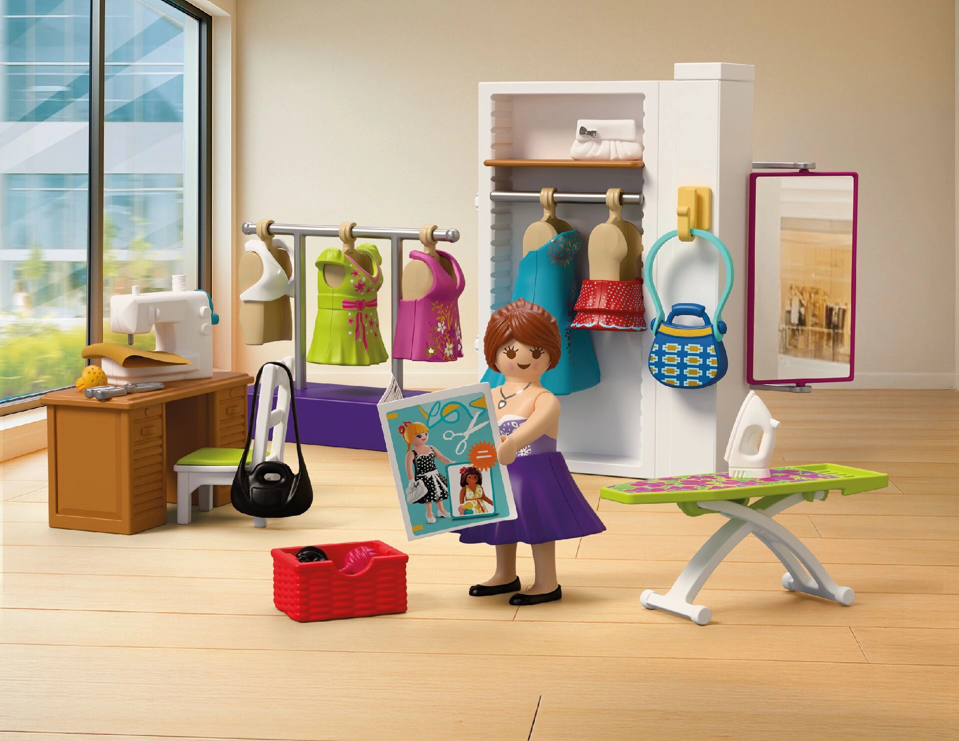 Alt til et komplet modeatelier er inkluderet: bord, stol, stoffer, saks, nålepude, nøgle garn, håndtasker og andre småting. Sættet består af 64 dele og kan kombineres med andre PLAYMOBIL-sæt for endnu rigere historier.