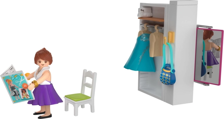 Sættet er ideelt til små stylister og designere. Takket være de detaljerede tilbehør – fra symaskinen over strygebræt med strygejern til garderobeskab med bøjler – træner børn finmotorik, kreativitet og sans for at kombinere outfits. Figuren kan let poseres og prøve nye modekreationer ved hjælp af spejlet.