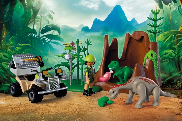 Tag på en eventyrlig ekspedition til dinosaurernes verden. Forskeren på den robuste quad med optrækkelig (pull-back) motor kører gennem frodig vegetation, hvor han opdager skjulte T‑Rex og Brachiosaurus unger. Med udstyret dokumenterer han lyde, registrerer adfærd og fodrer dem med passende føde. Takket være den aftagelige transportkasse og opbevaringsplads til værktøj er hver tur nem og overskuelig.