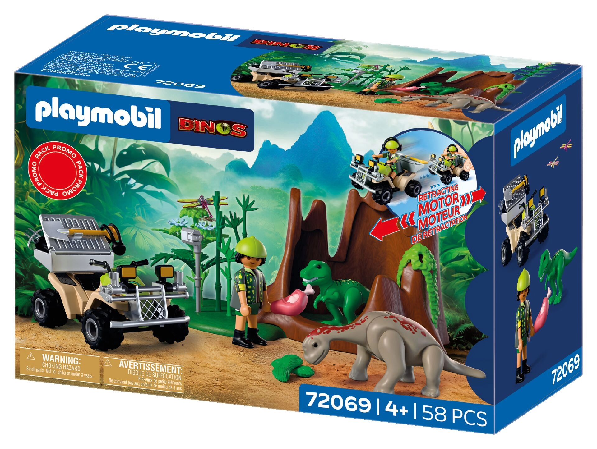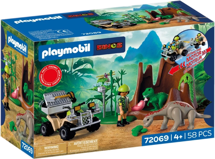 Udforsk forhistorien med PLAYMOBIL Dinos, hvor en modig forsker kører gennem vildnisset på en quad med pull-back motor, finder en T‑Rex unge og en Brachiosaurus unge og indsamler prøver. Med en aftagelig transportkasse og et rigt udvalg af tilbehør til realistiske ekspeditioner og udvikling af børns fantasi.