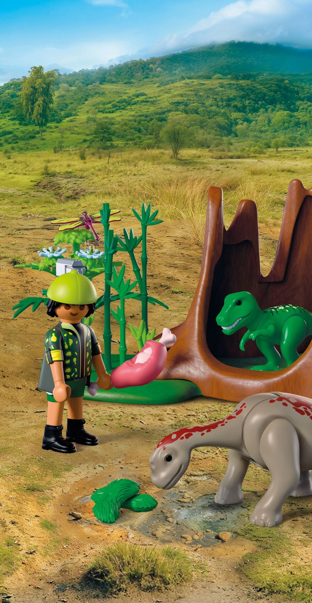 Realistiske miljødetaljer – træstub, bambus, blomster og bevoksning – sammen med dinosaurfigurerne trækker børn ind i spændende fortællinger. Sættet er ideelt til rolleleg og kan kombineres med andre PLAYMOBIL-sæt for en endnu større verden af forhistoriske eventyr.