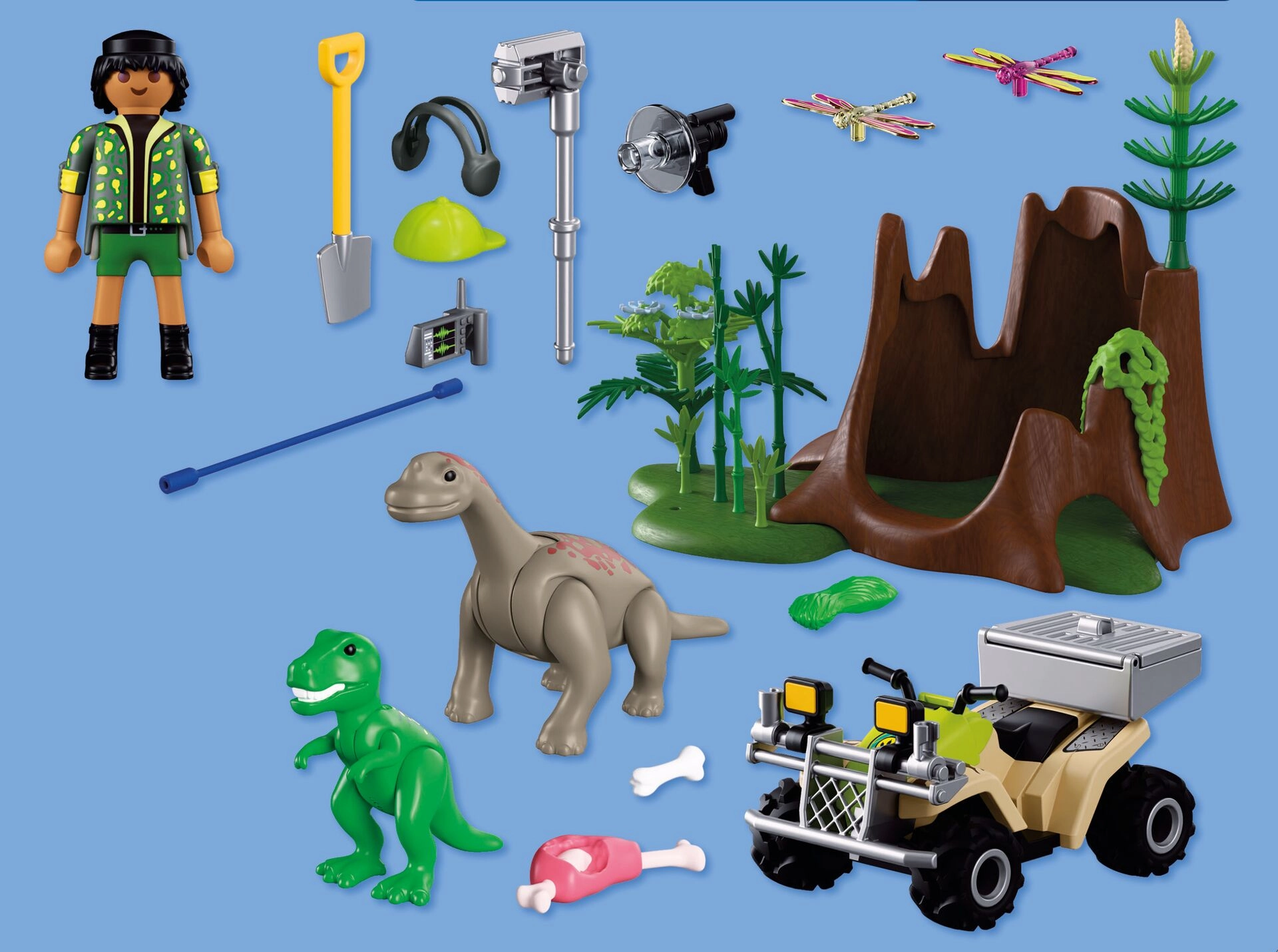 - Forskerfigur (~7,5 cm), quad med pull-back motor, aftagelig transportkasse, hjelm med hovedtelefoner, skovl, retningsbestemt mikrofon, kamera, træstub, base, 8 kranse af grene, 5 bambusplanter, 3 blomster, hængende bevoksning, knogle med kød, knogle, 2 tuer græs, T‑Rex unge, Brachiosaurus unge, 2 guldsmede