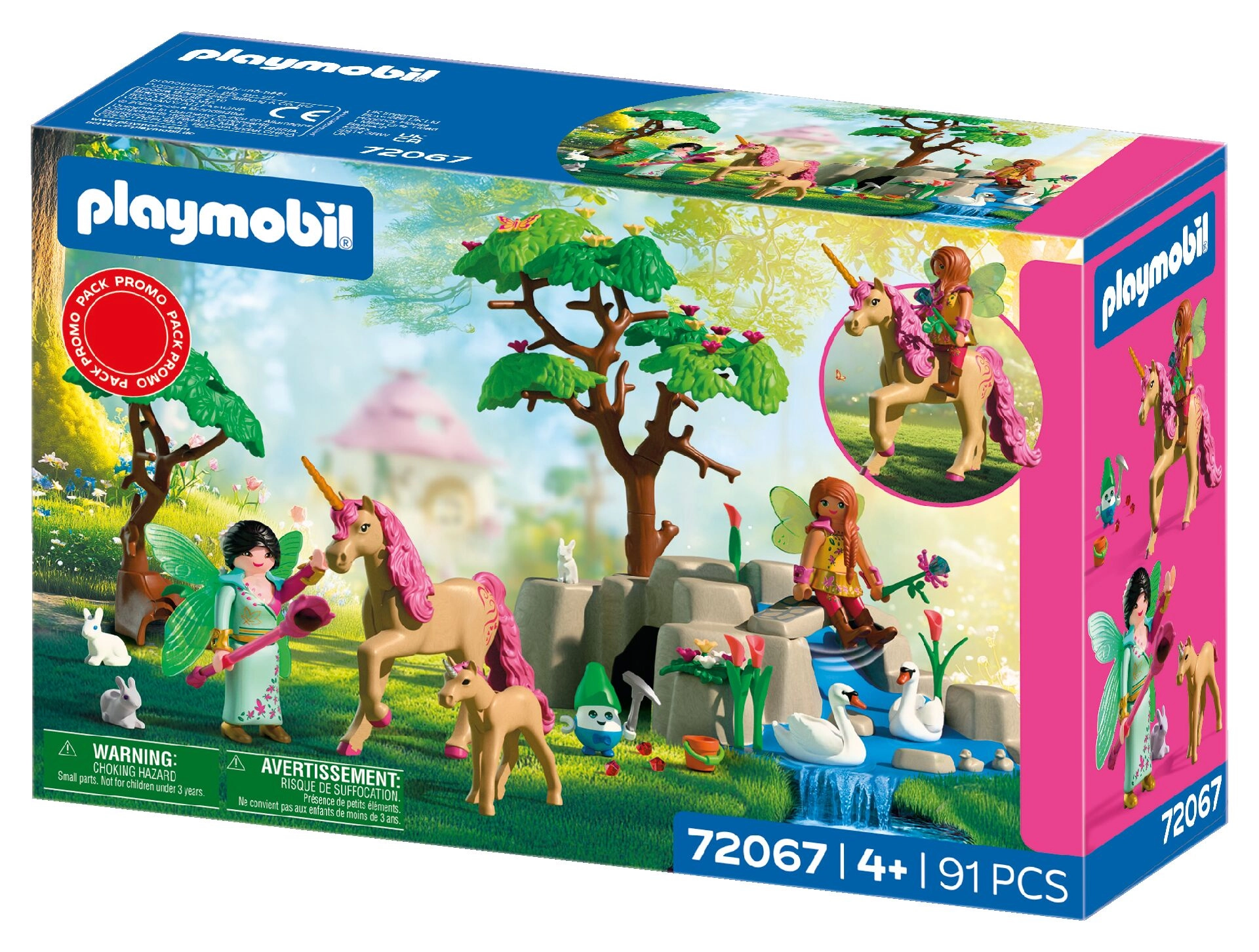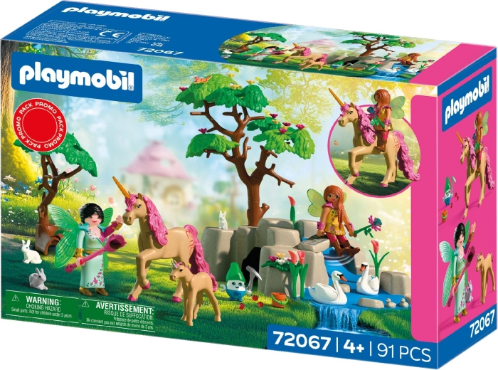 Oplev en magisk fantasiverden med PLAYMOBIL-sættet, hvor to feer rejser med en enhjørning og dens føl gennem et malerisk landskab fuld af dyr, blomster og glitrende skatte. Med masser af tilbehør, bevægelige figurer og mulighed for ridning på enhjørningen tilbyder sættet endeløse historier og kreativ leg for børn fra 4 år.