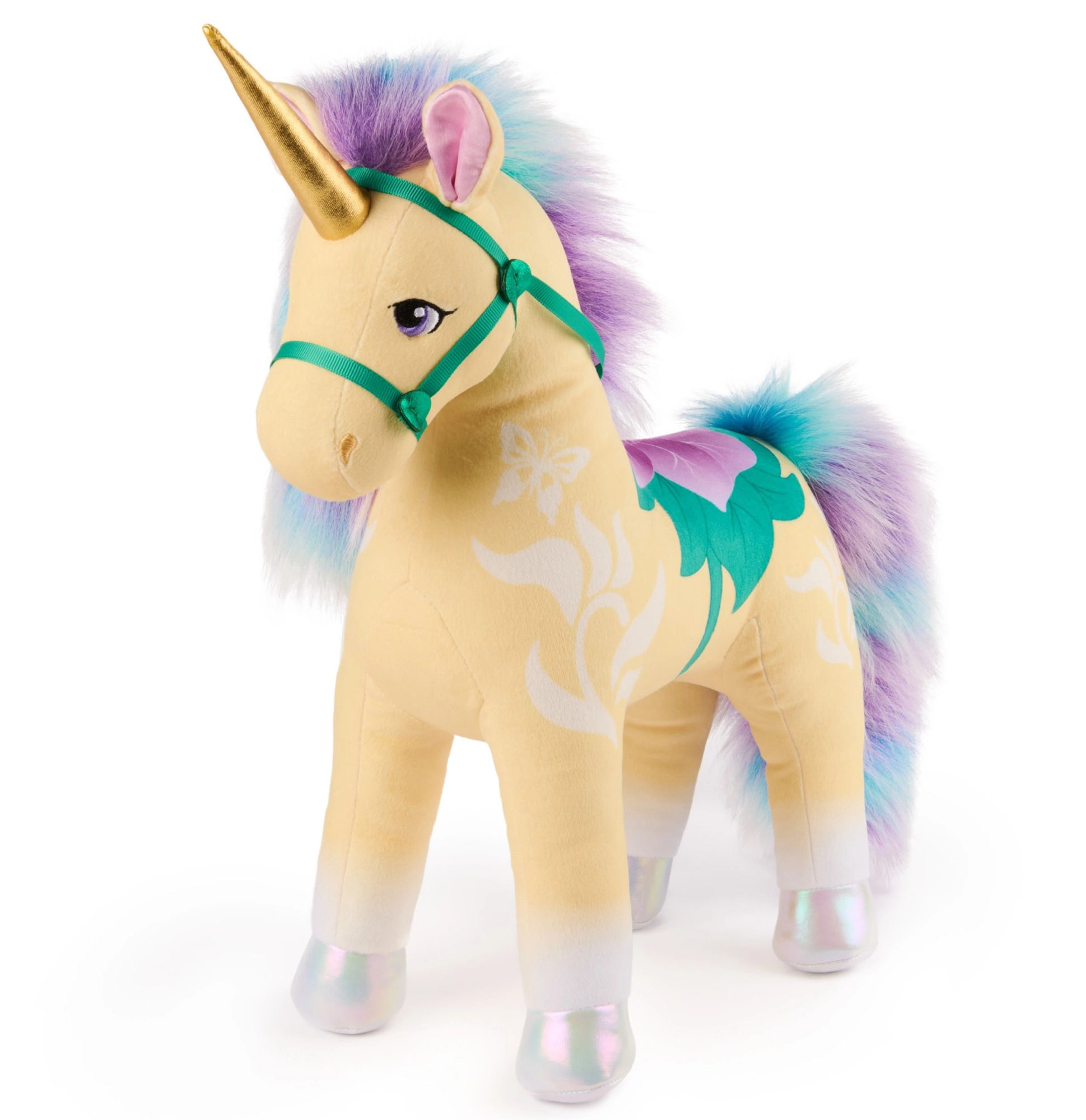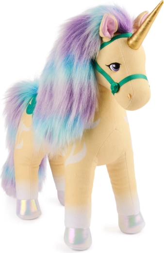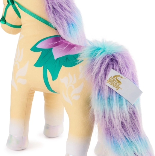 Træd ind i fantasiens verden med en stilfuld plysvens inspireret af den populære Netflix-serie og bøgerne Unicorn Academy. Enhjørningen Leaf afspejler trofast figurens udtryk – fra det gyldne horn og de iriserende hove til de fine blomsterdetaljer og grøn-lilla seletøj. Takket være det bløde materiale i høj kvalitet er den perfekt til både kram og daglig leg.