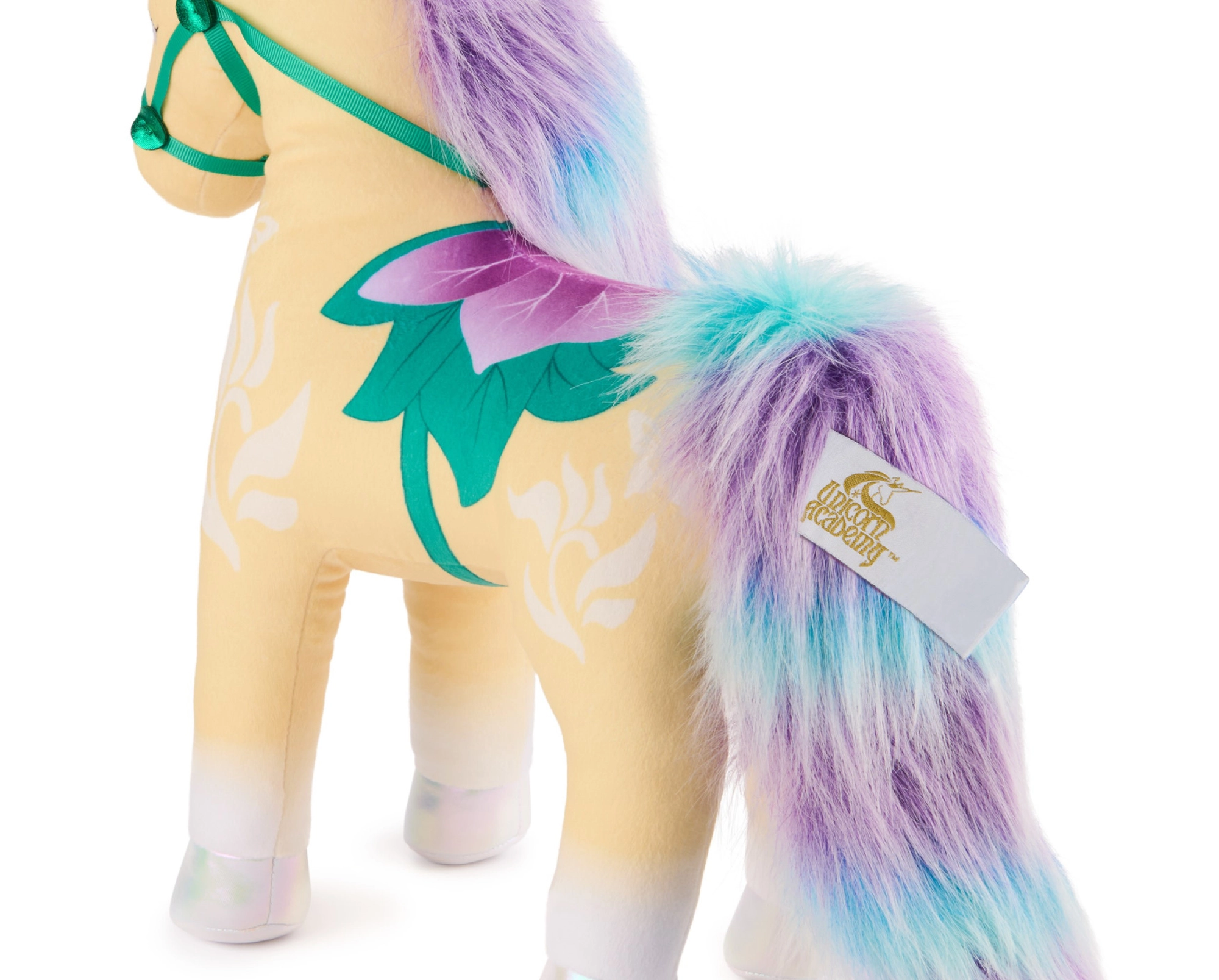 Det gyldne horn, de iriserende hove og den botaniske sadel med tøjler i grøn-lilla farver refererer trofast til figuren Leaf fra Unicorn Academy-universet.