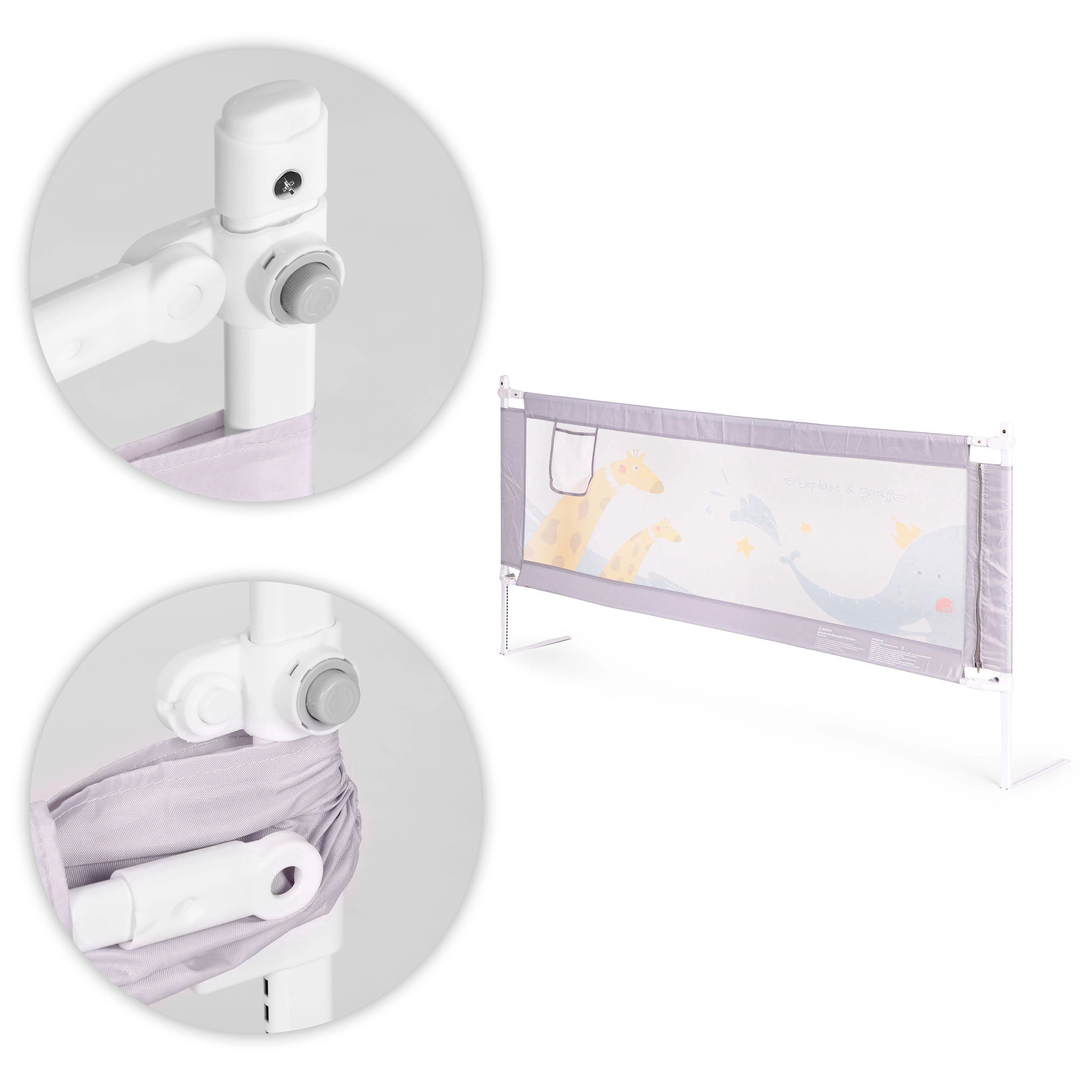 Takket være universel montering og muligheden for at forbinde flere gitre skaber du nemt et sikkert, hyggeligt område på enhver side af sengen. Holdbare materialer (stål, 210D Oxford-tekstil, polyester) garanterer lang levetid og nem vedligeholdelse – betrækket kan tages af og vaskes. Det diskrete dyremotiv passer ind på børneværelset, og lommen til sut, servietter eller legetøj holder det nødvendige lige ved hånden.