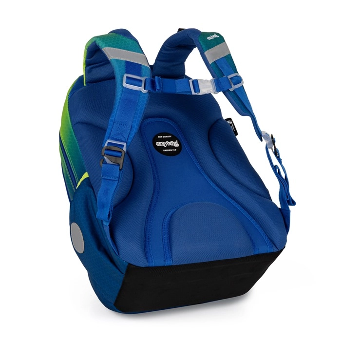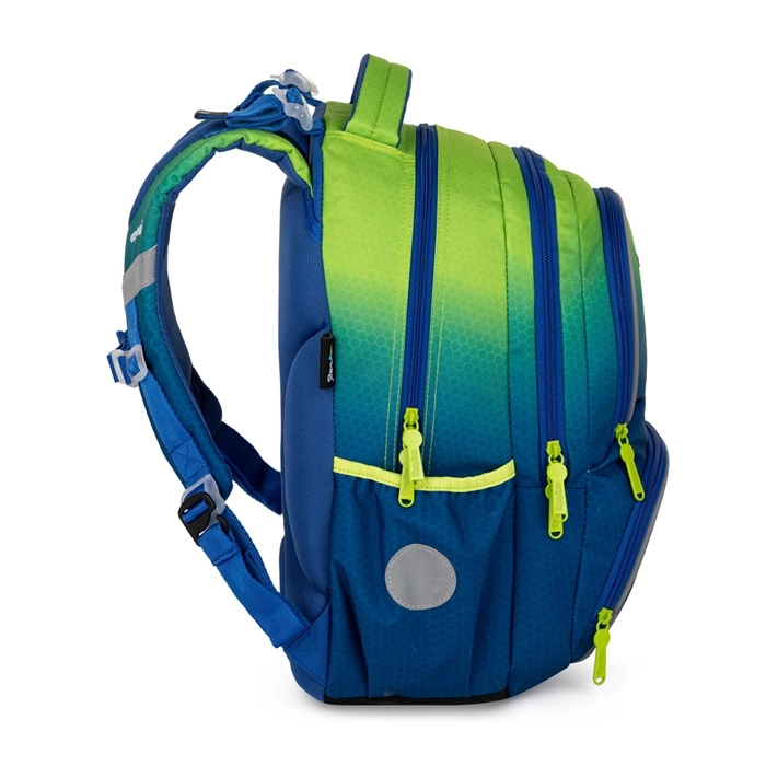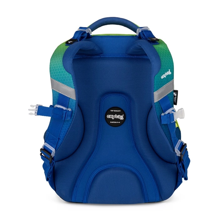 Praktisk skolesæt til elever i 2.–4. klasse inkluderer den ergonomiske OXY NEXT-rygsæk, et rummeligt penalhus og en gymnastikpose. Rygsækken har anatomisk formet ryg, polstrede stropper med brystrem, reflekterende elementer og mange lommer for perfekt organisering. Den robuste vandafvisende bund, let konstruktion og moderne ombré-design i blå-grønne nuancer sikrer komfort og sikkerhed hver skoledag.