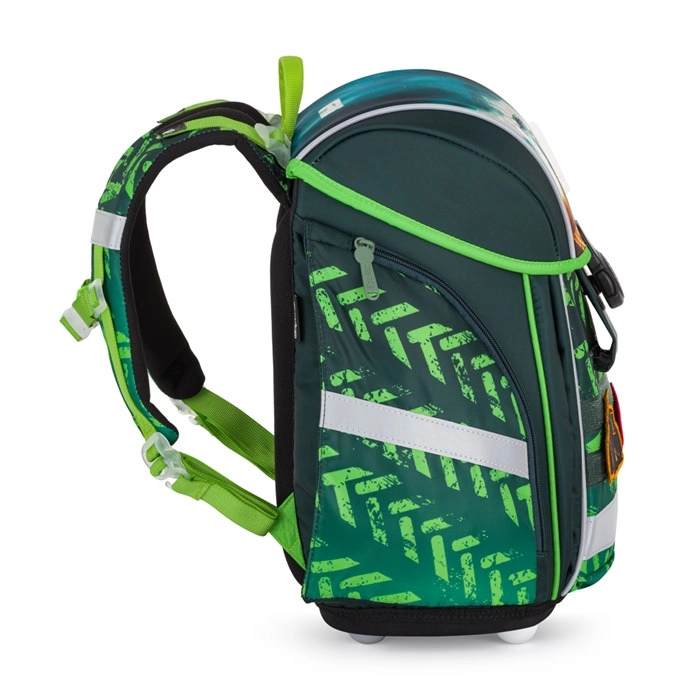 For sikker og stabil bæring er rygsækken udstyret med en brystrem og kompressionsstropper, desuden med ekstra kroge for nem fastgørelse. Reflekselementer øger barnets synlighed i skumring og mørke. Magnetlukningen muliggør hurtig og enkel åbning, mens den indvendige opdeler og de mange lommer holder bøger, hæfter og småting pænt på plads.