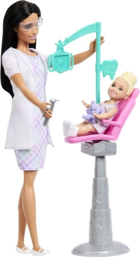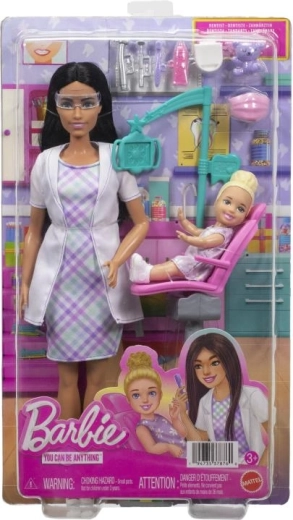 Barbie tandlæge legesæt inspirerer børn til at udforske verdenen af sundhedspleje og tandhygiejne. Sættet indeholder en mørkhåret BARBIE-dukke i elegant kjole og laboratoriekittel, en lille patient i en lyserød stol samt autentisk tilbehør som instrumenter, kop, tandbørste og tandpasta. Takket være den justerbare stol og bevægelige dele er legen ekstra realistisk.